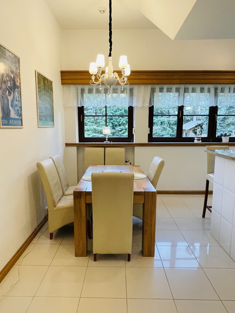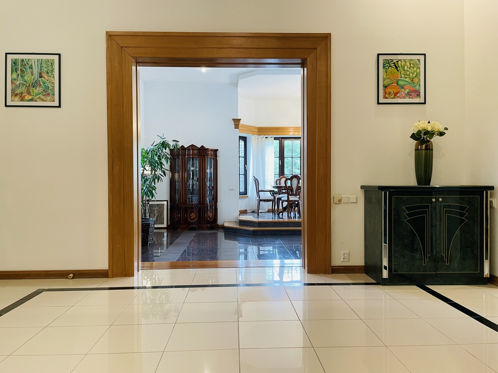 Wszystkie wykończenia drewniane- listwy, karnisze, schody i inne są wykonane z drewna egzotycznego. Parapety z marmuru.