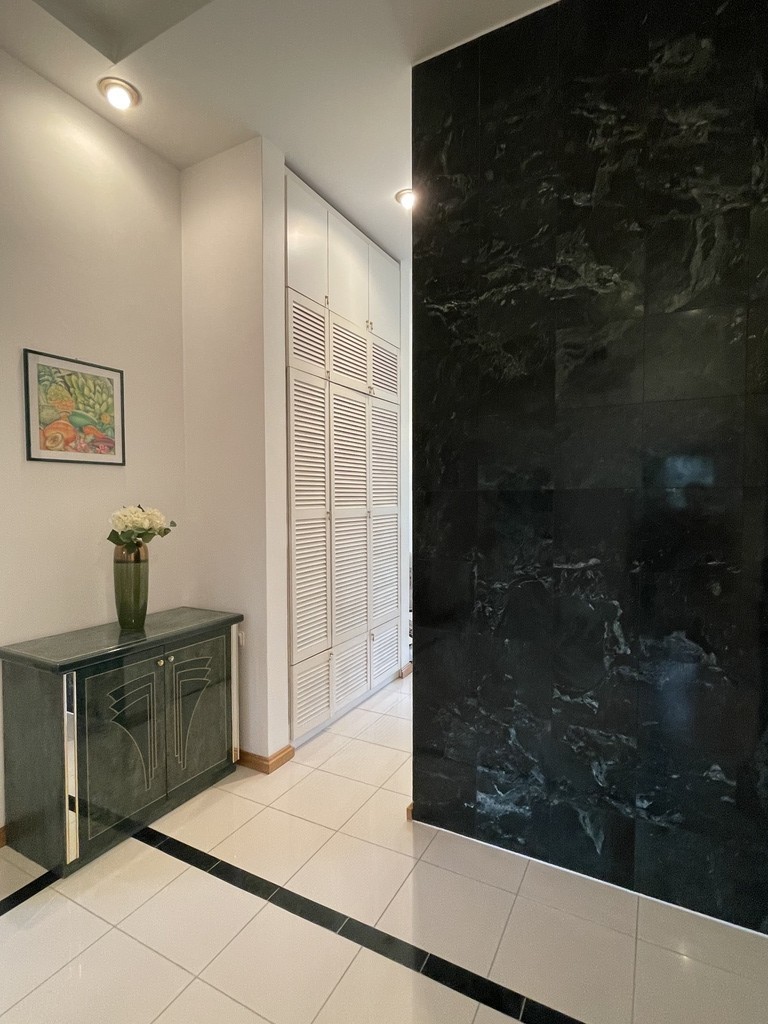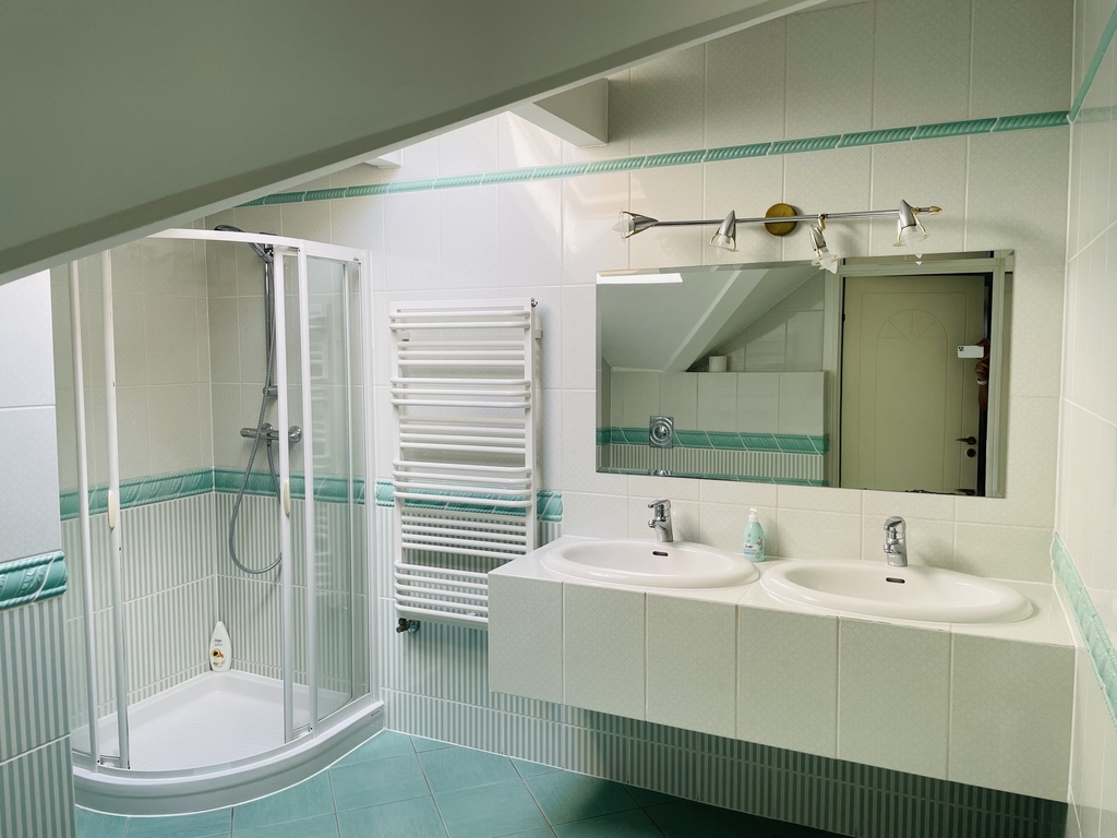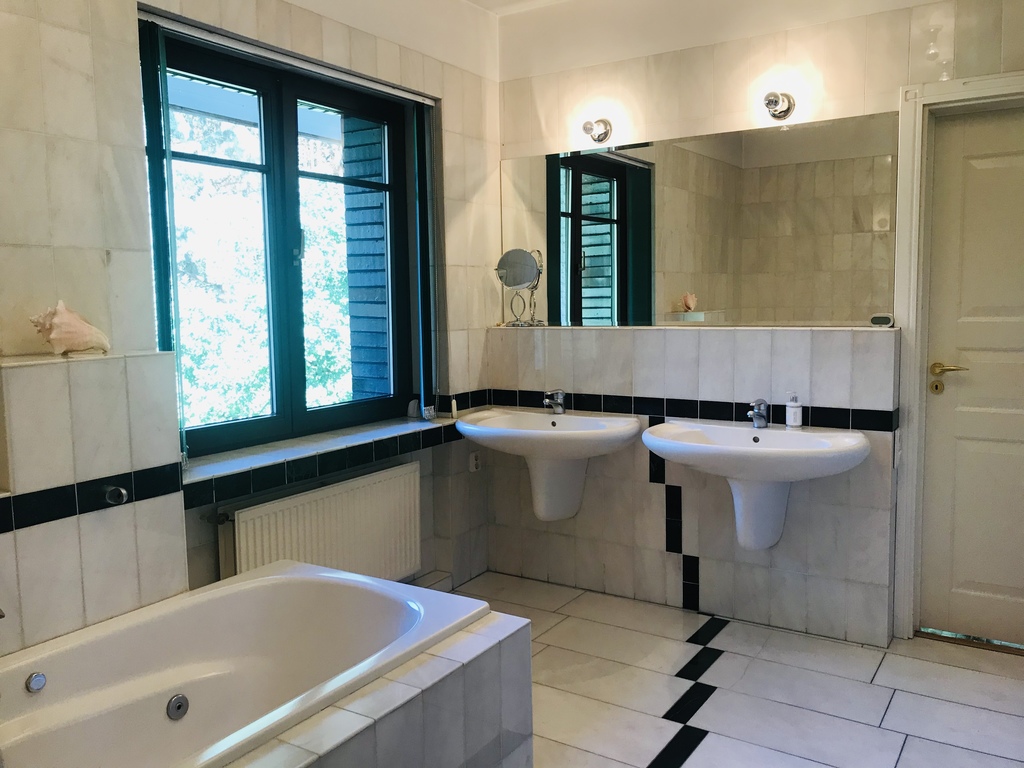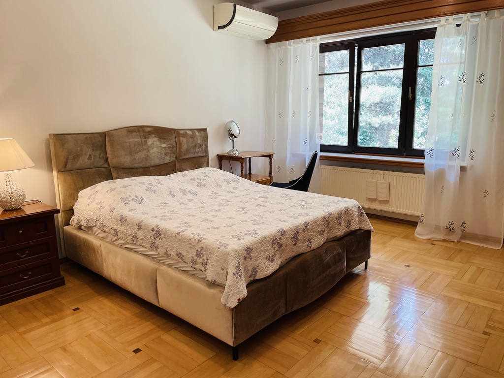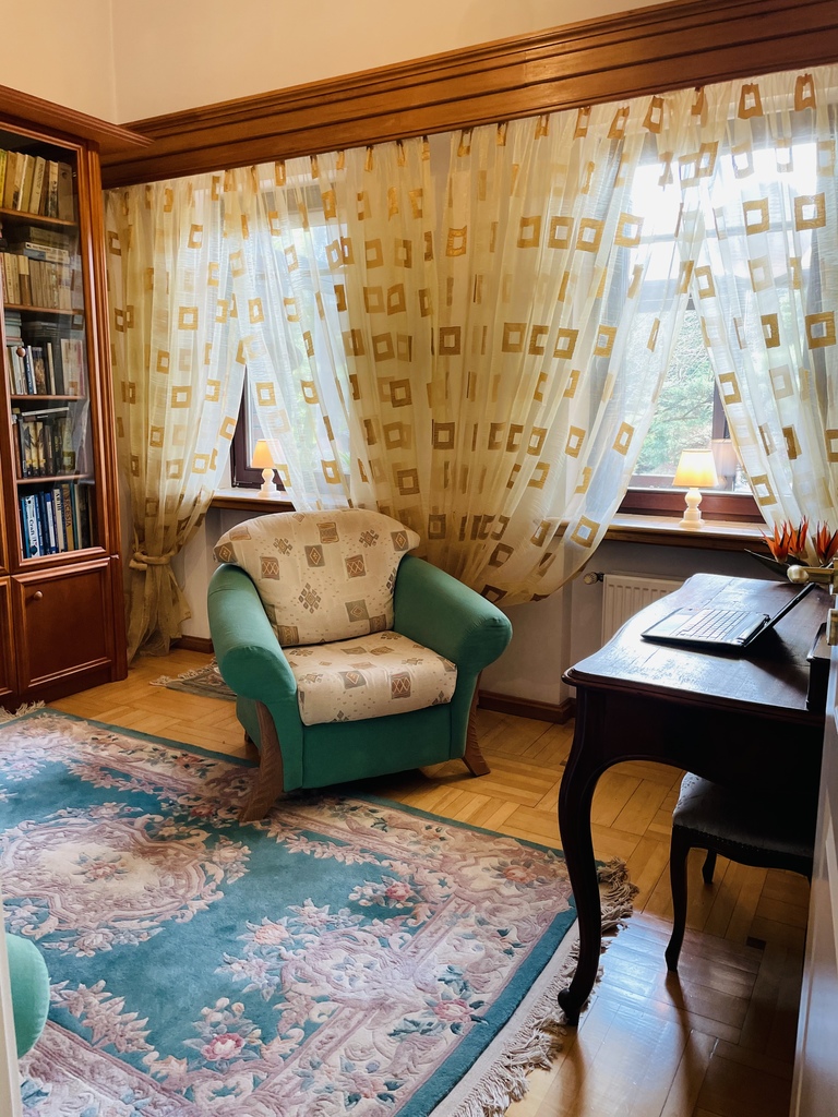 Wyższy poziom to 3 sypialnie : 22m2, 14m2, 12m2, pokój kąpielowy o pow. 12m2, aneks dobrze oświetlony do czytania 12m2 , łącznik komunikacyjny. Łazienka wykończona marmurem, armatura IDEAL STANDARD.