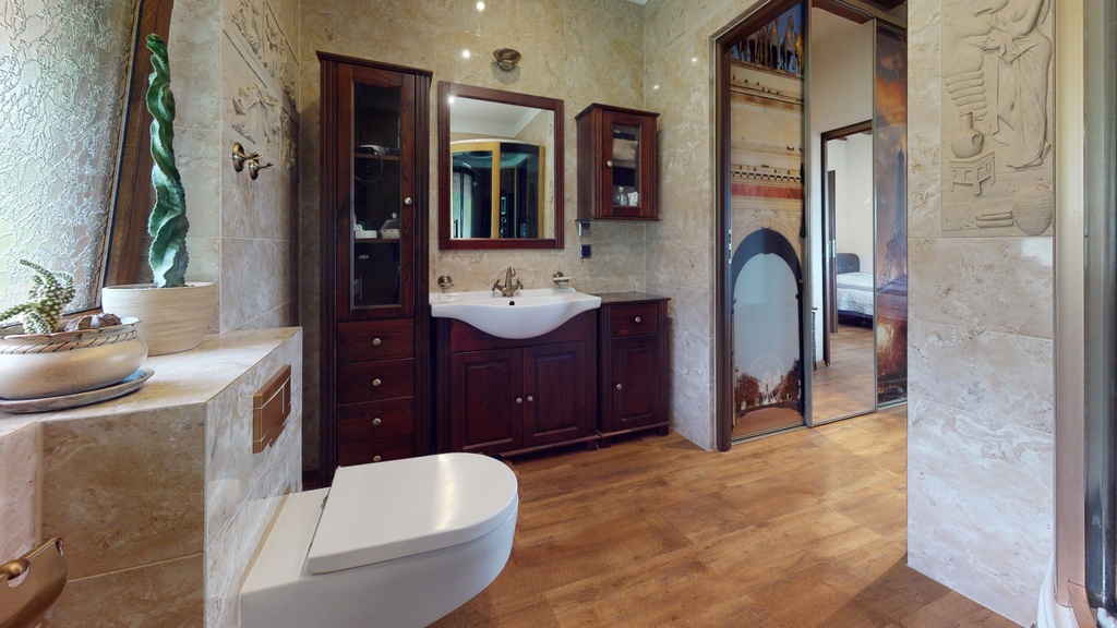 Komfort i funkcjonalność pomieszczeń jak i otoczenia wokół budynku zwraca szczególną uwagę. Liczne nasadzenia i krzewy, taras od strony południowej z wyjściem na basen (podgrzewany, fitry).