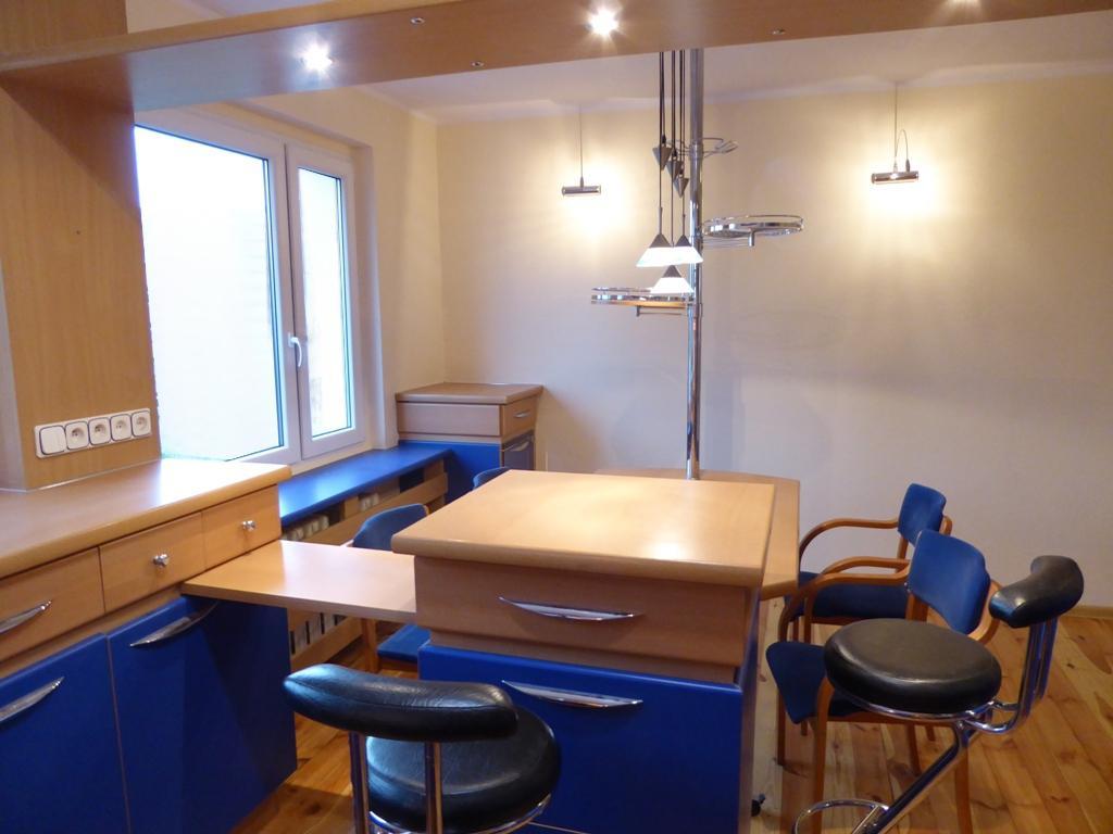 Drugi pokój został bardzo ciekawie zaaranżowany – dominuje w nim wielka kuchnia z wyspą i stołem jadalnianym na 4 osoby ( z wysuwanym, dodatkowym blatem, znacznie go powiększającym).