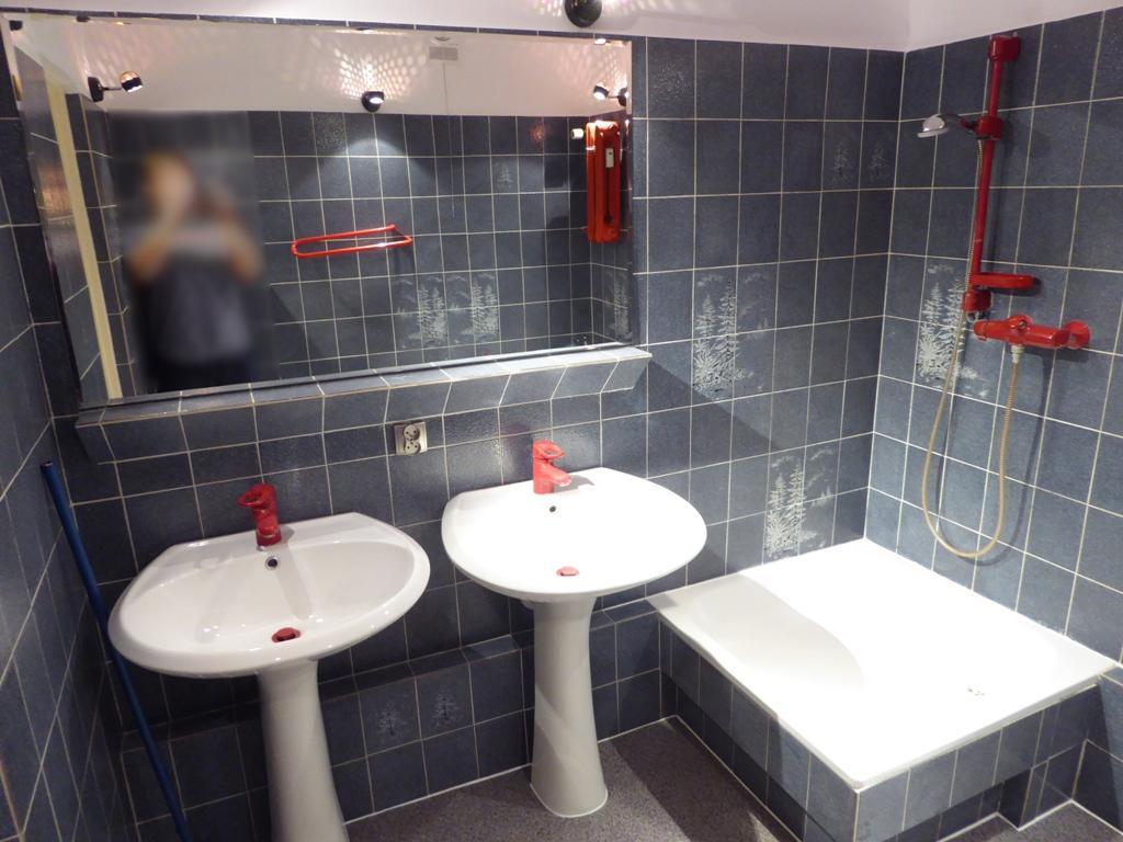Łazienka ładnie zaaranżowana – dwie umywalki, prysznic.