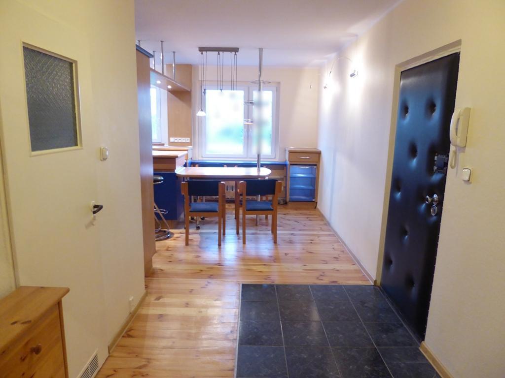 W całym mieszkaniu na podłogach deska podłogowa, przy drzwiach wejściowych glazura.