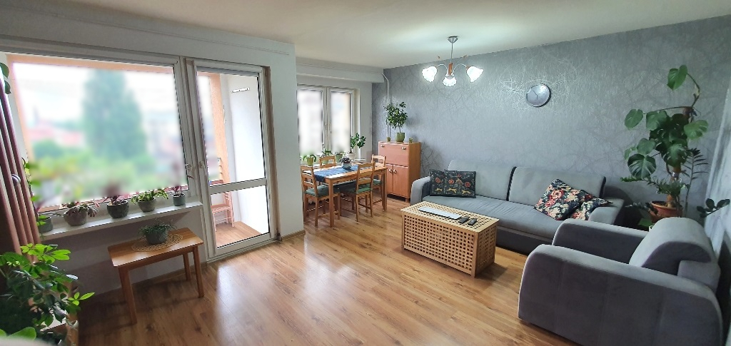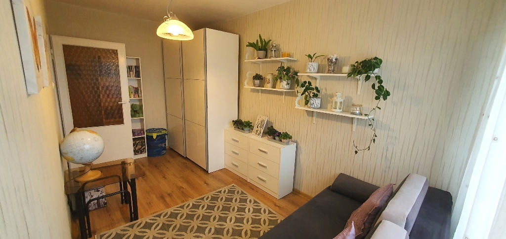 - SALON (23m2) - przestronny, jasny, słoneczny, z wyjściem na balkon typu loggia ( 3 m2), na podłodze bardzo dobrej jakości panele, ściany gładzone w części tapeta ozdobna,