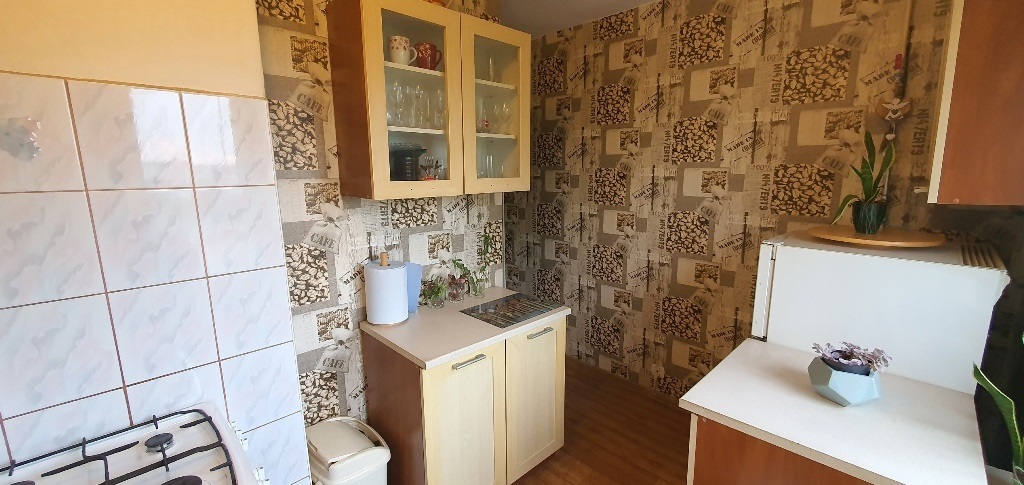 - KUCHNIA (7 m2) – oddzielna, widna, z oknem, ładnie zaaranżowana, pomiędzy blatem a szafkami wiszącymi kafelki, na podłodze panele; w cenie pozostają meble kuchenne na wymiar i sprzęt AGD: piekarnikiem i płytą gazową, okap, lodówka z zamrażarką.
