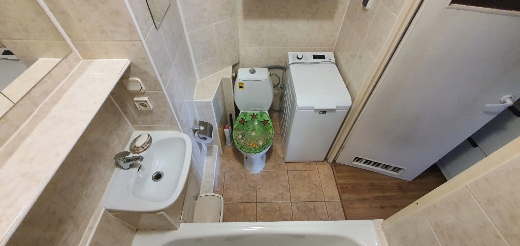 - ŁAZIENKA (4 m2) – a w niej wanna, umywalka, toaleta, pralka, na podłodze terakota, na ścianach glazura.