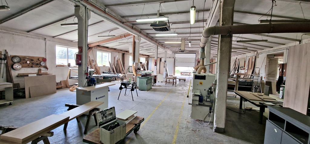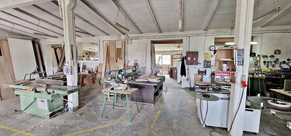 Główna hala produkcyjna 383,87m2,mniejsza 93,83m2,pozostałe 58,61m2 i 46,84m2.Wysokość max hali 3,5m.Obiekt murowany, wyposażony w instalacje elektryczną, wodną, kanalizacyjną do zbiornika bezodpływowego 12000l,grzewczą z nawiewem ciepłego powietrza z pieca.