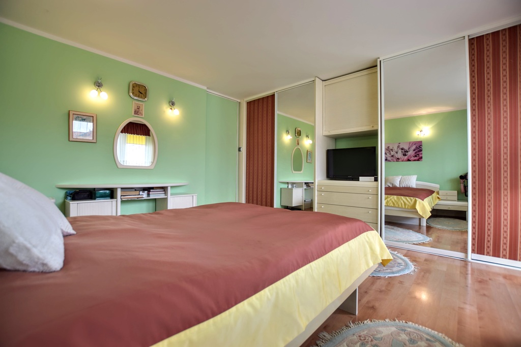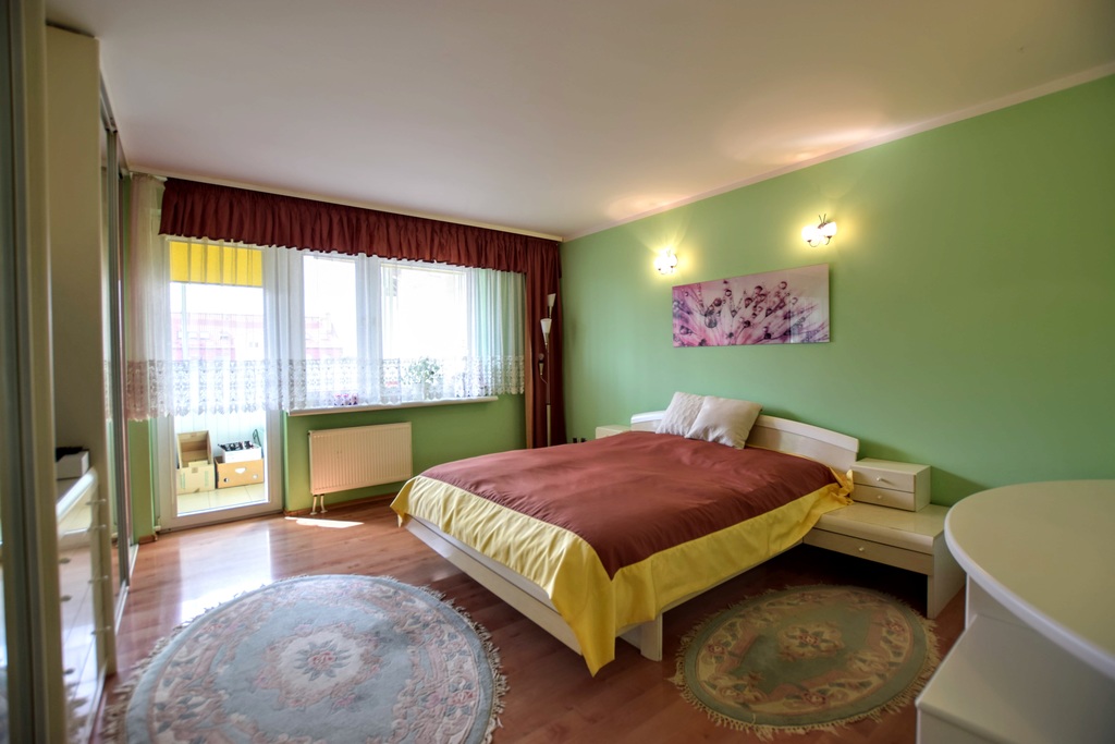 -przestronna sypialnia z zabudowaną szafą oraz wyjsciem na balkon,
