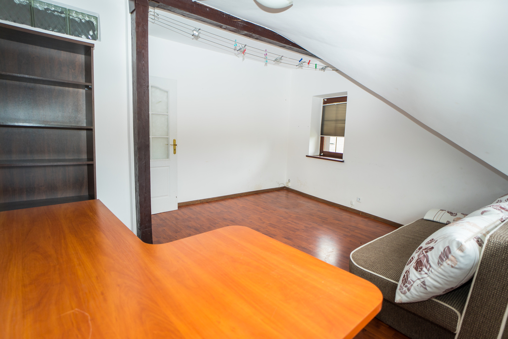 Na parterze trzy pomieszczenia biurowe, pomieszczenie gospodarcze i wc, na piętrze trzy pokoje, kuchnia, łazienka (piętro może pełnić funkcję mieszkalną, bazę noclegową).