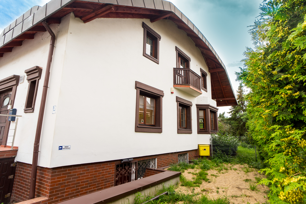 Główny budynek - 200m2, to 7 pomieszczeń biurowych (w tym duża sala o pow. 30m2 z wyjściem na taras 50m2 i ogród 1468m2), recepcja, zaplecze kuchenne i sanitarne.