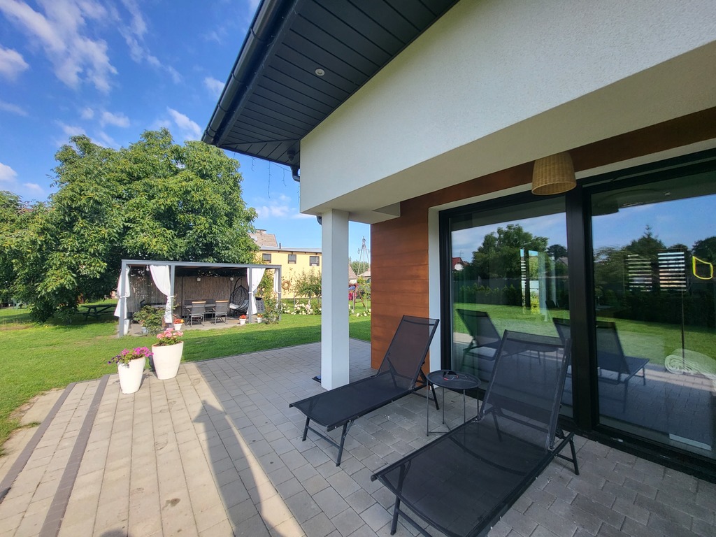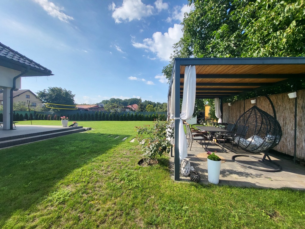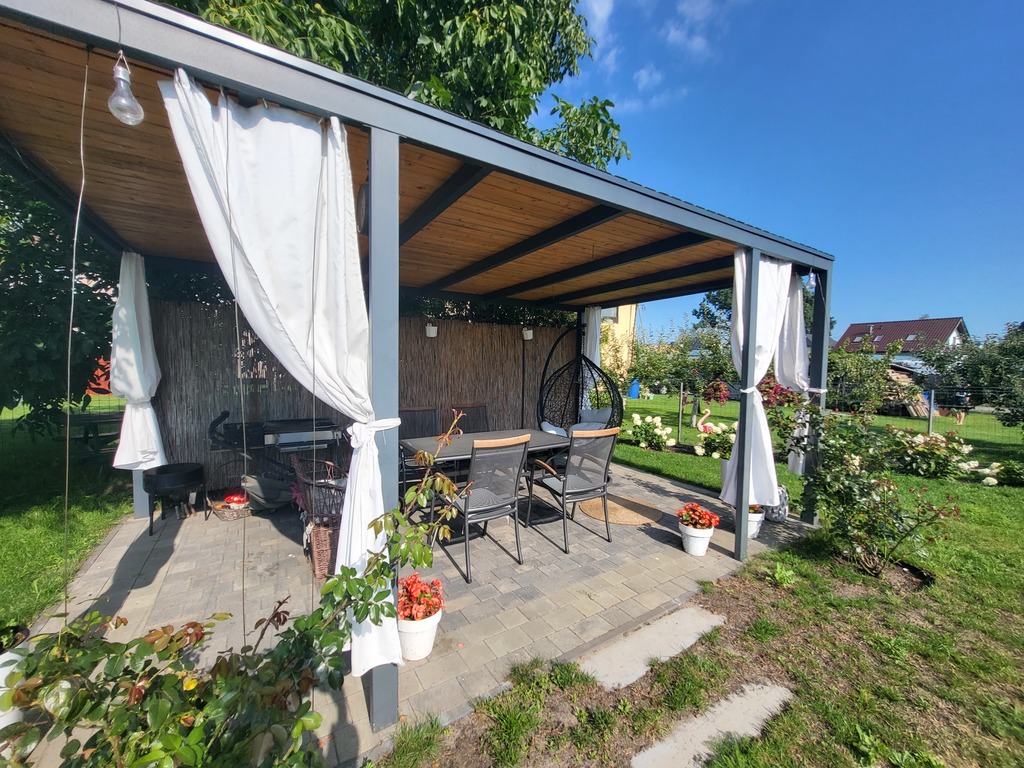 Działka stanowi powierzchnię 756 m², jest w pełni ogrodzona oraz zadbana. Znajduje się na niej zadaszone miejsce do biesiadowania oraz grilowania. Z salonu również jest wyjście na taras, na którym można odpocząć oraz napić się kawy. Na podjeździe przed domem znajdują się miejsca postojowe.