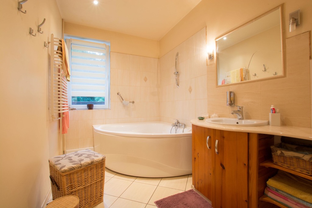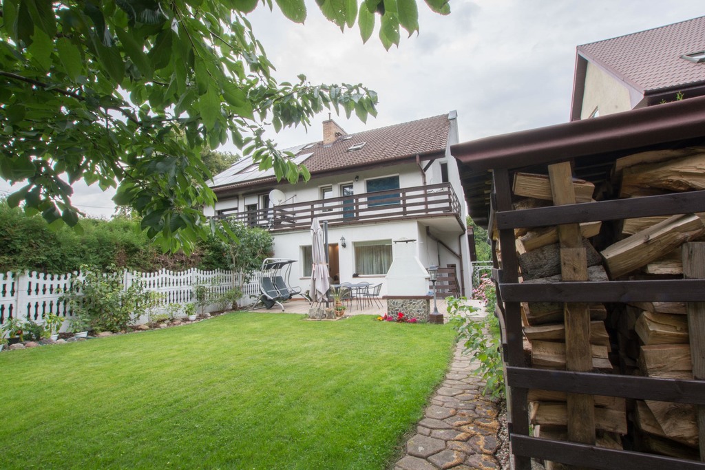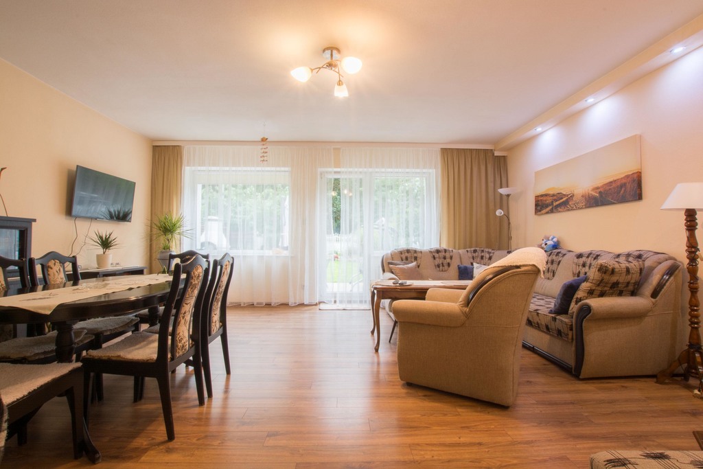 Na parterze znajduje się salon z kominkiem (płaszcz wodny) z niego wyjście na zadbany ogród z licznymi nasadzeniami - brama prowadząca do puszczy Bukowej! - idealne miejsce na spacer czy weekendowe wycieczki.