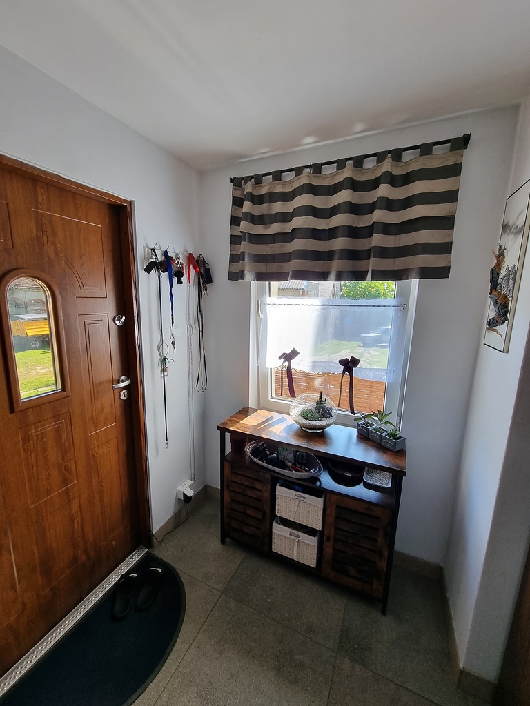 Okna PCV. Na podłodze panele i terakota.