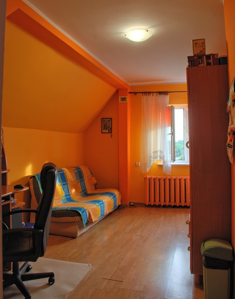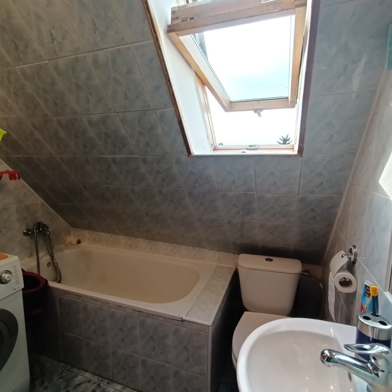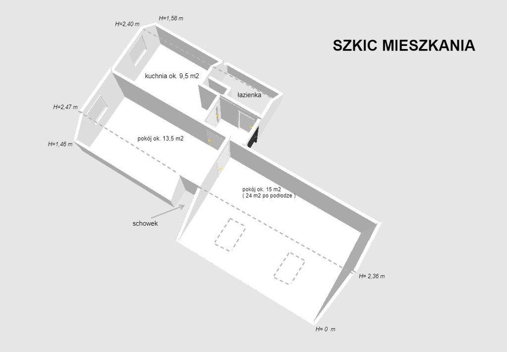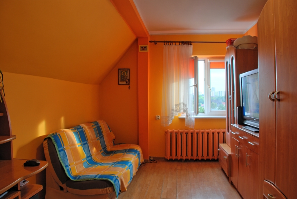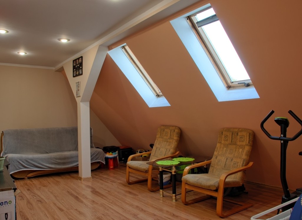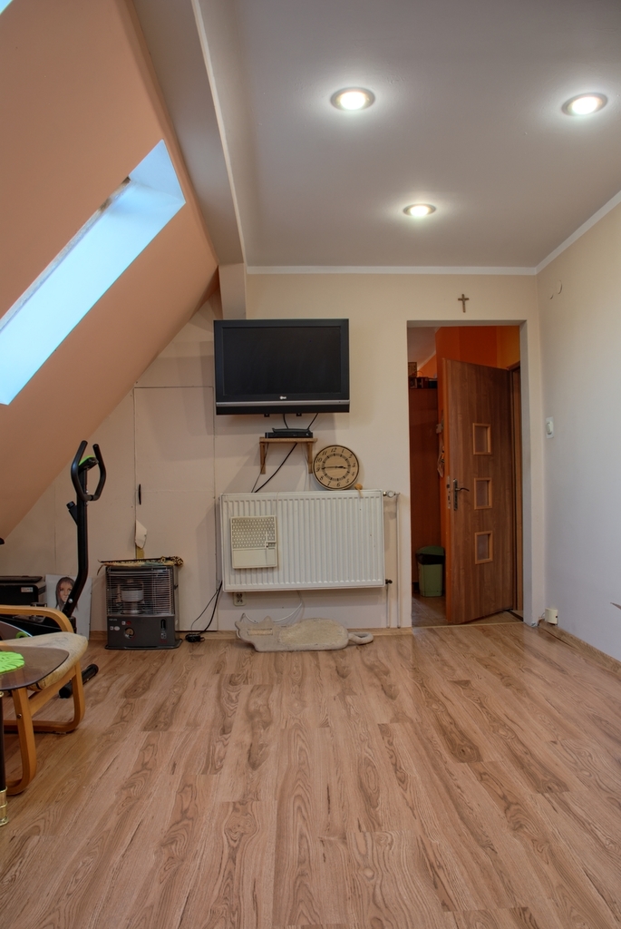 Mieszkanie o powierzchni 49,52 m2 w skład którego wchodzą 2 pokoje, kuchnia oraz łazienka z wc. Możliwość powiększenia mieszkania o drugi poziom dzięki przestrzeni nad mieszkaniem. W pokojach na podłodze panele ( w jednym z pokoi do wymiany ) , ściany wygładzone i malowane. Większy pokój o powierzchni użytkowej około 15 m2 ( po podłodze ok 24 m2 ) . Mniejszy pokój o powierzchni użytkowej około 13,5. Duża kuchnia ( ok. 9,5 m2 ) w której oprócz mebli i sprzętów AGD z powodzeniem mieści się duży stół z krzesłami. Kuchnia widna z oknem. Łazienka razem z wc. Znajduje się w niej między innymi wanna, umywalka oraz miejsce na pralkę. Łazienka z oknem dachowym. Sufity w całym mieszkaniu podwieszane.