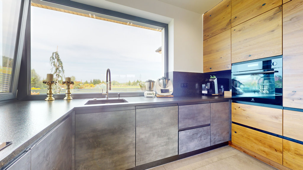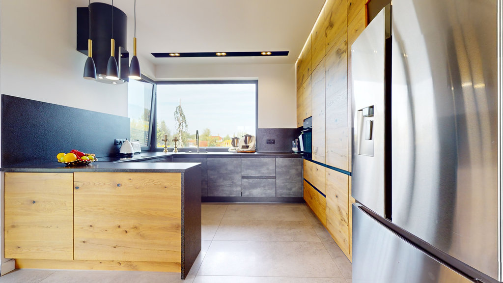 Kuchnia na wymiar, zabudowa z wysokiej jakości forniru, blaty wykończone granitem. Z kuchni przejście do dużej, wygodnej spiżarni.