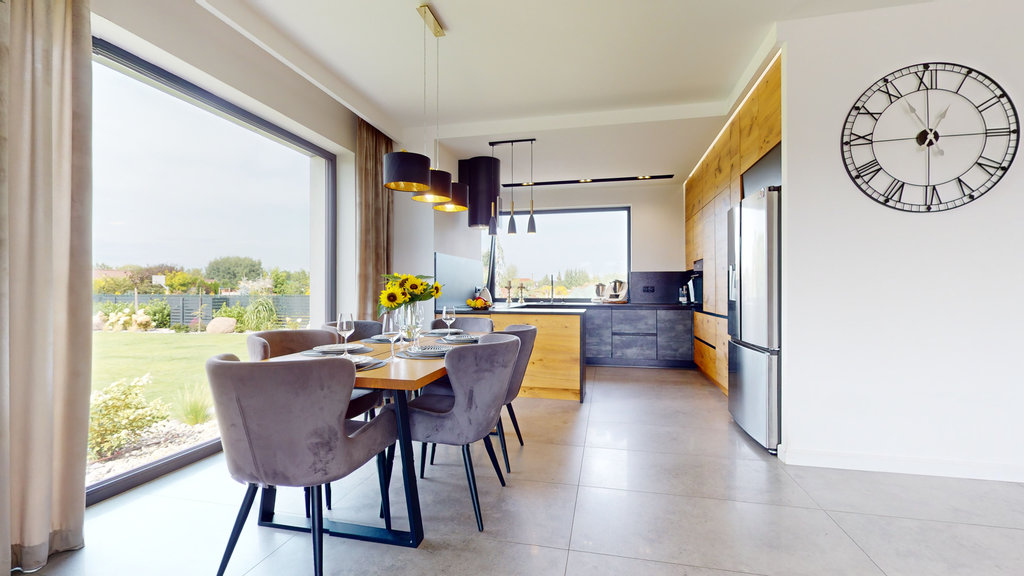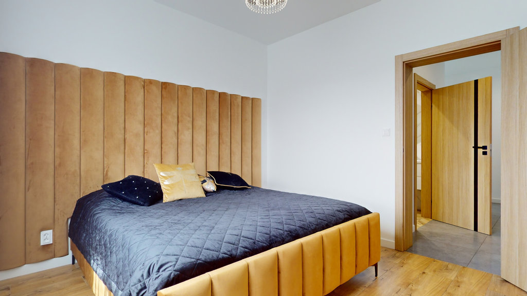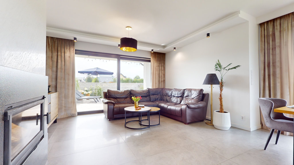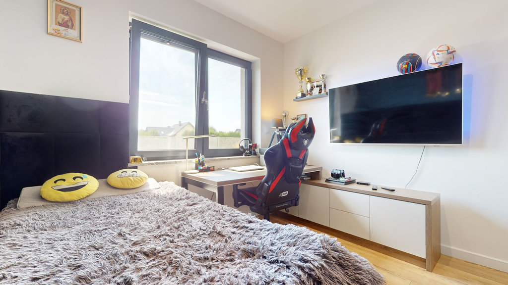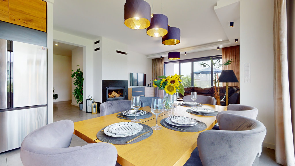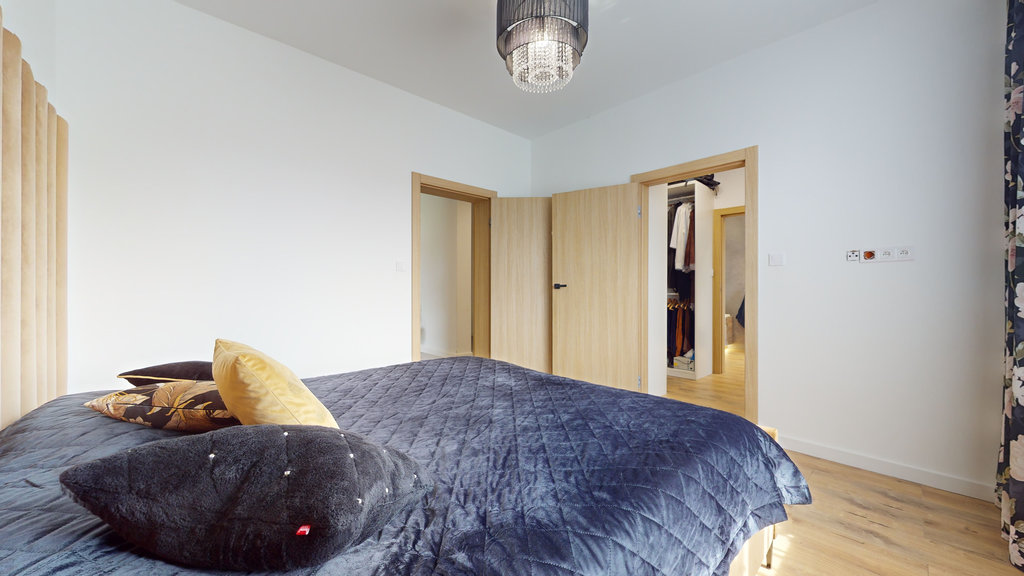 Na parterze przestronny salon z otwartą kuchnią i spiżarnią. Trzy sypialnie, z której jedna z dedykowaną łazienką i garderobą, druga z garderobą i ostatnia z dużą, pojemną szafą w zabudowie.