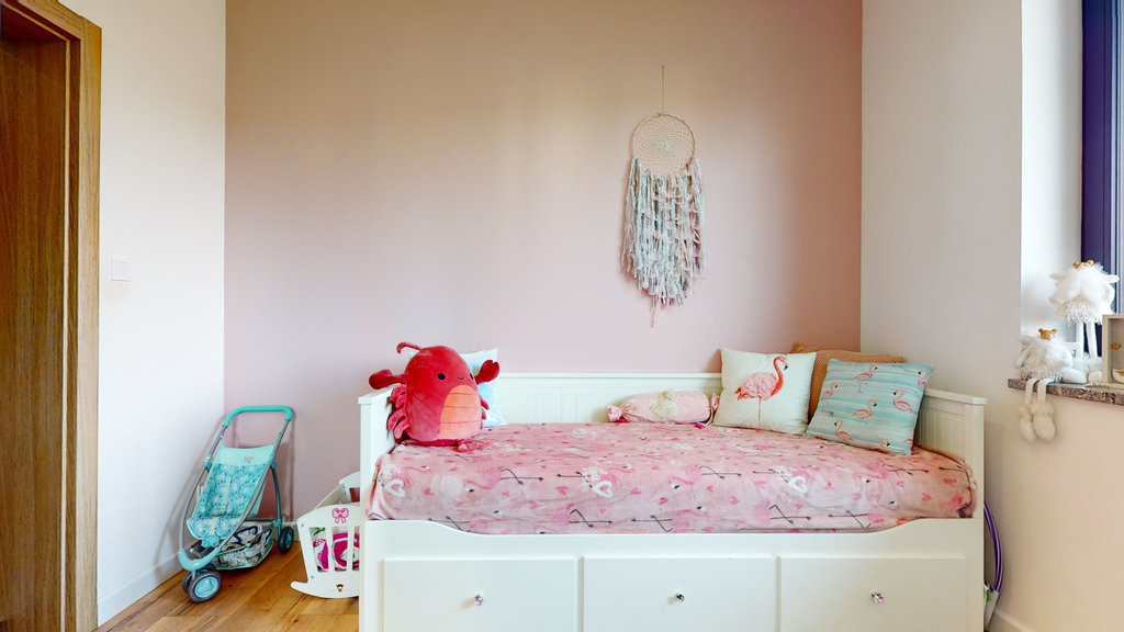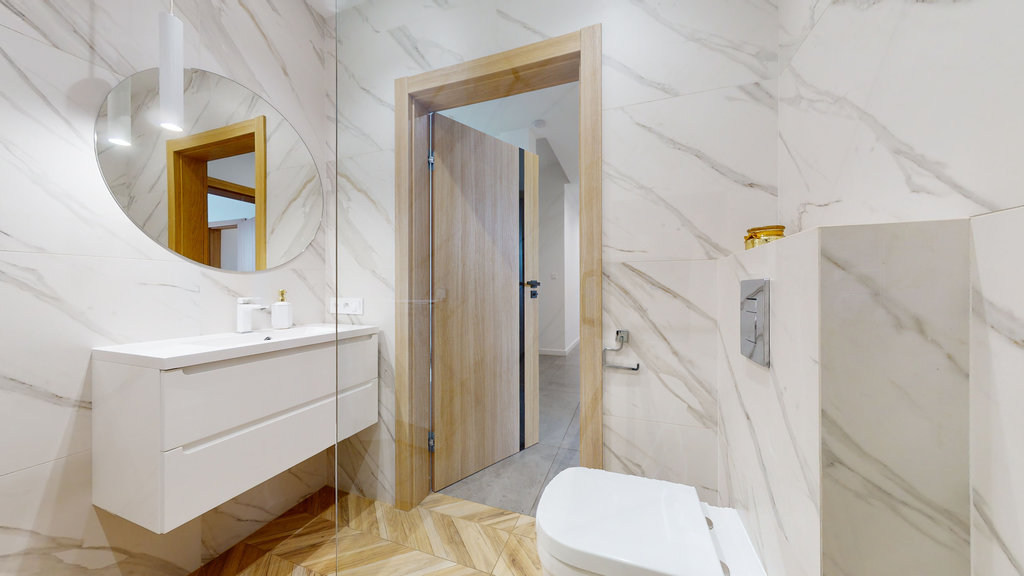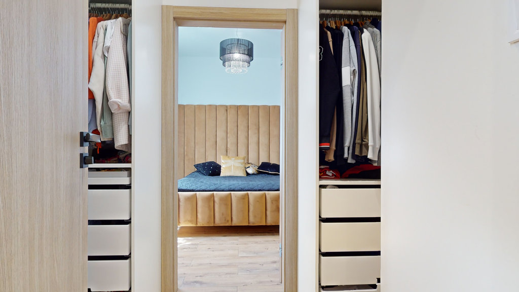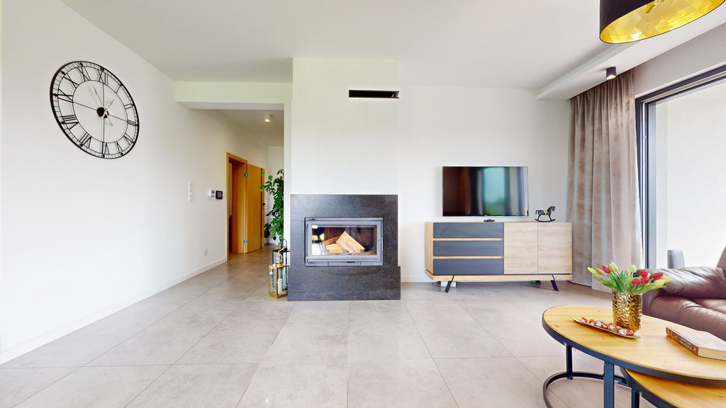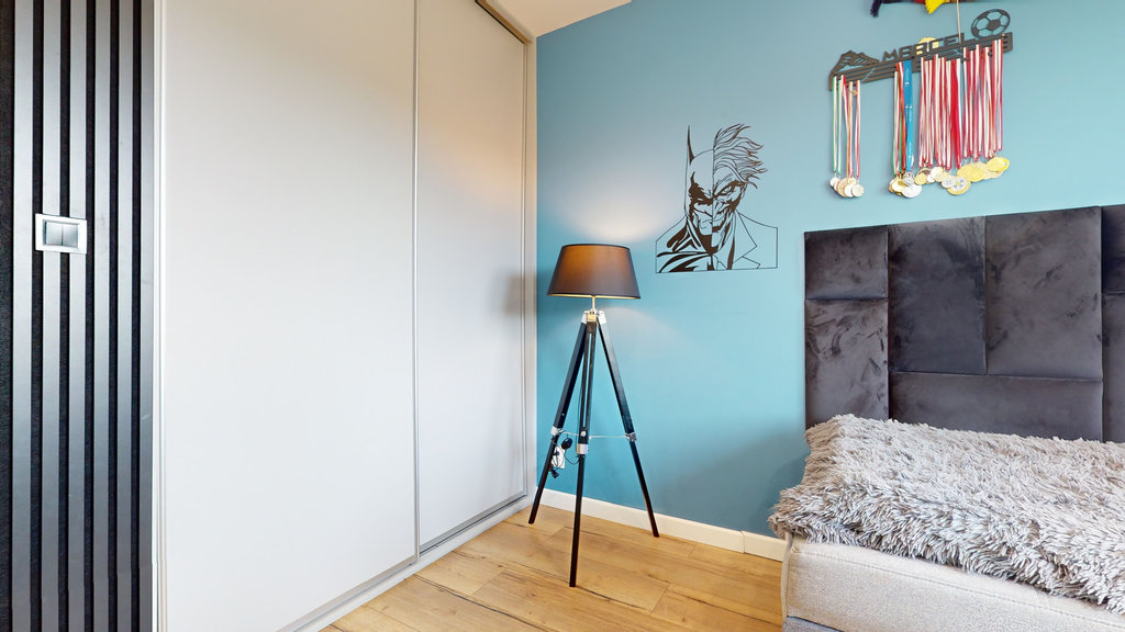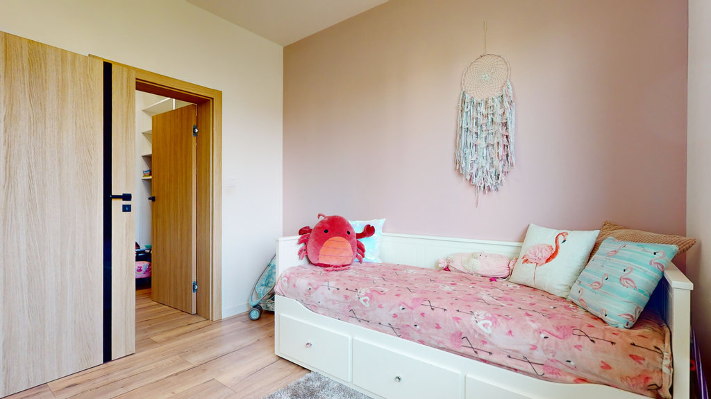 Na parterze przestronny salon z otwartą kuchnią i spiżarnią. Trzy sypialnie, z której jedna z dedykowaną łazienką i garderobą, druga z garderobą i ostatnia z dużą, pojemną szafą w zabudowie.
