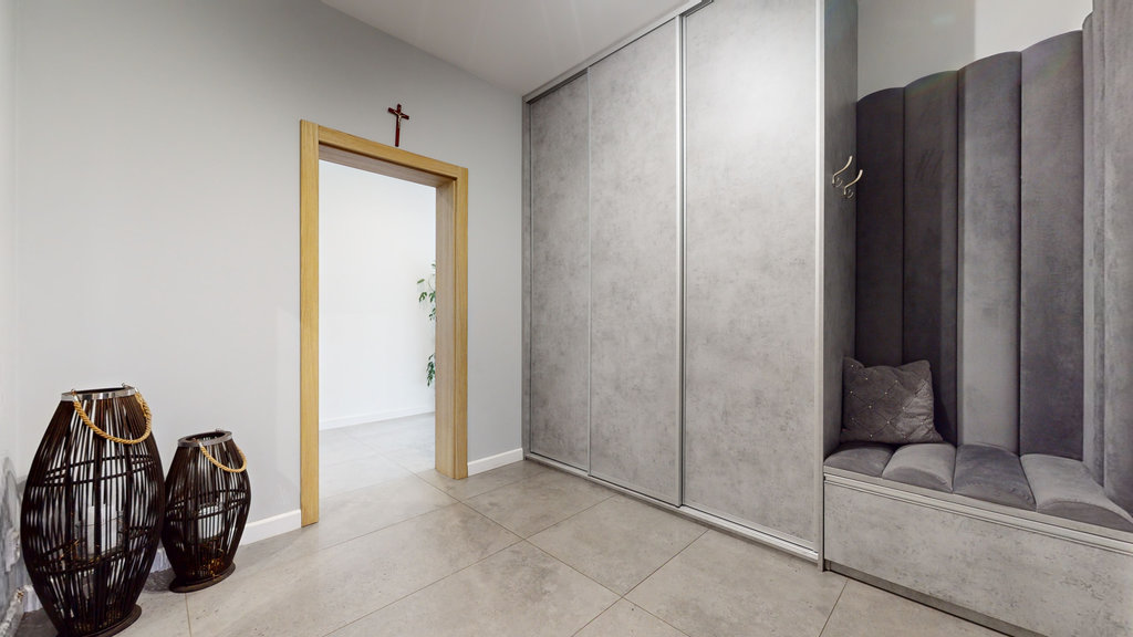W przedpokoju duża szafa w zabudowie stałej, przejście do kotłowni i dwustanowiskowego garażu.