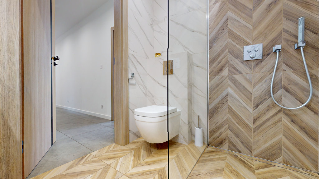 Dwie łazienki, jedna przy sypialni z wanną, druga ogólnodostępna z kabiną prysznicową.
