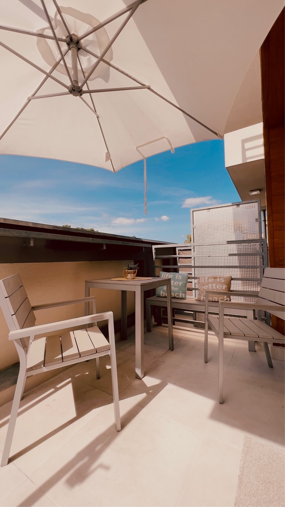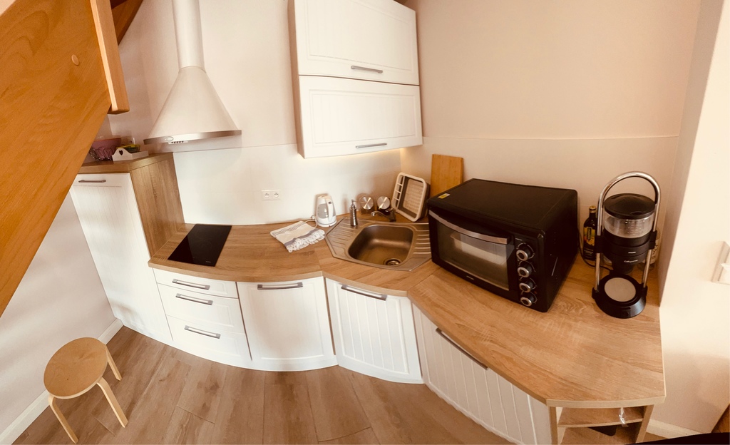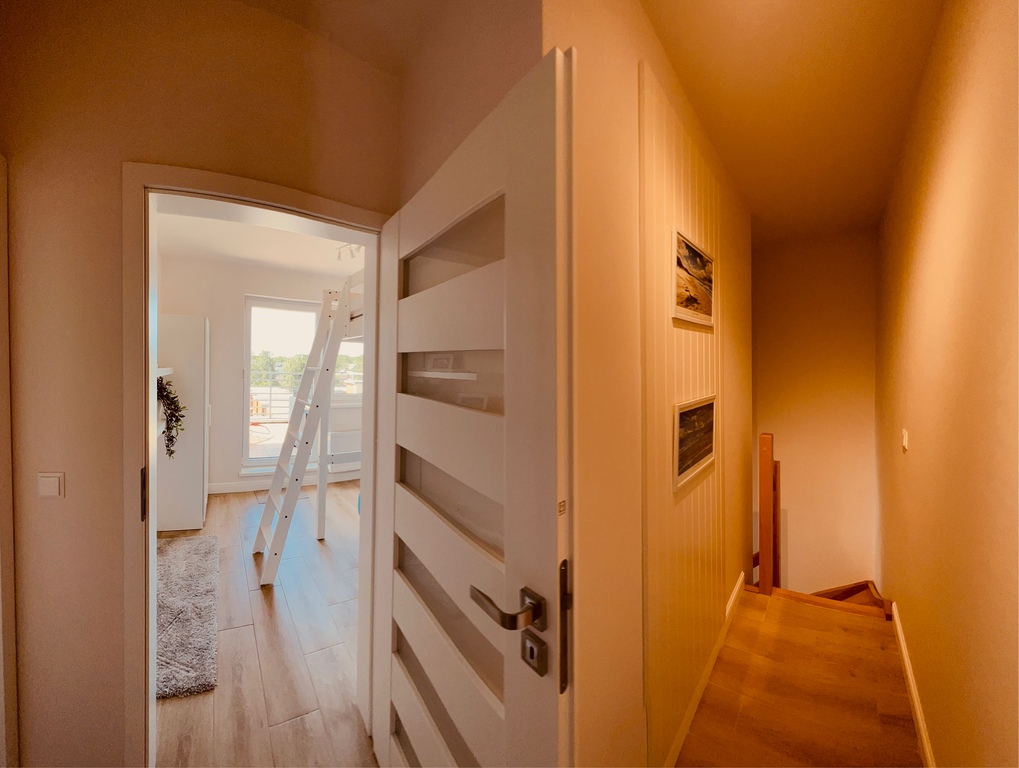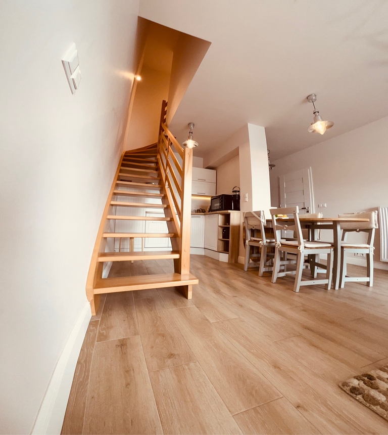 Dół: to przestronny salon z nowocześnie wyposażoną kuchnia, łazienką z prysznicem i balkon o powierzchni 6 metrów.
