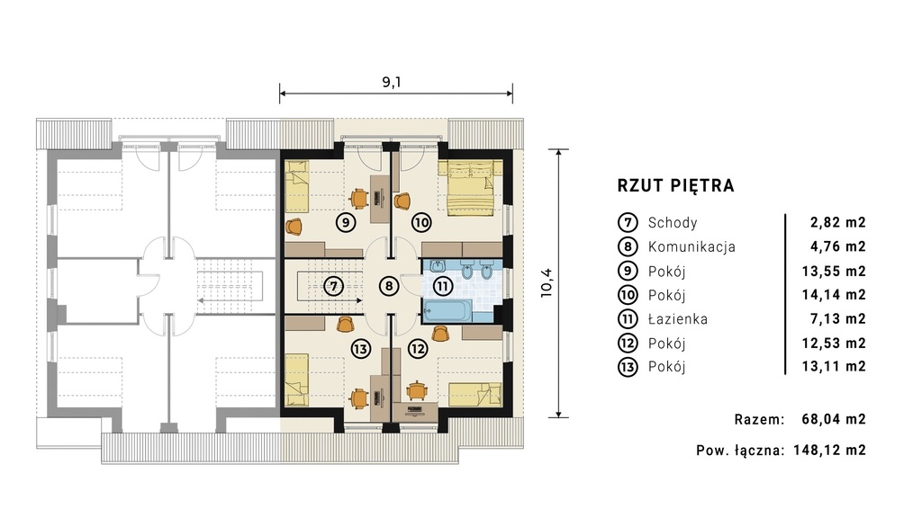 Na piętrze ( 68,04mkw ) dostępne są: