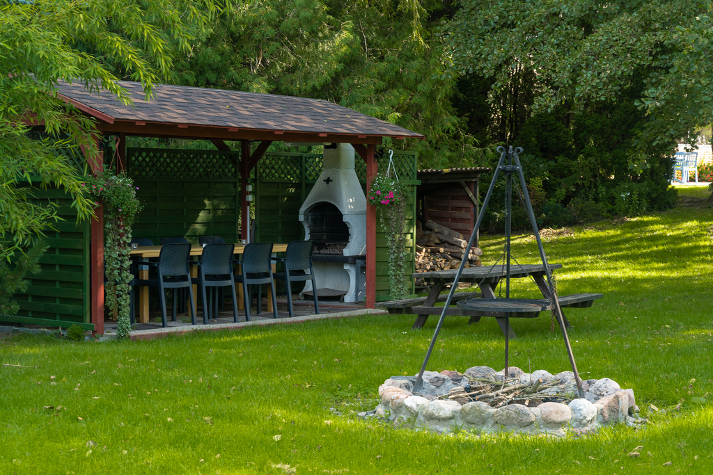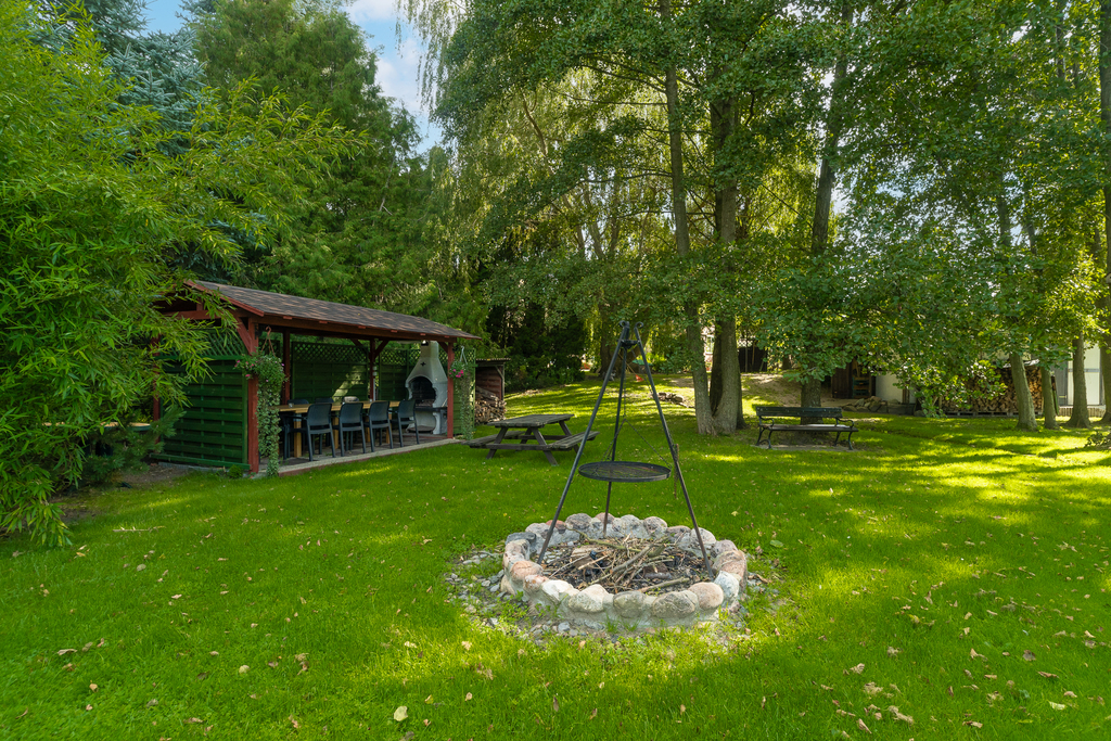 Cały teren całkowicie zagospodarowany, ogrodzony i obsadzony 30 letnim żywopłotem. Liczne nasadzenia, zadrzewienia - ponad 120 gatunków drzew, krzewów i roślin wieloletnich, zarybiony staw z pomostem, miejsce na ognisko, grilowanie, zaciszne ławeczki tworzą idealne warunki do wypoczynku na łonie natury.