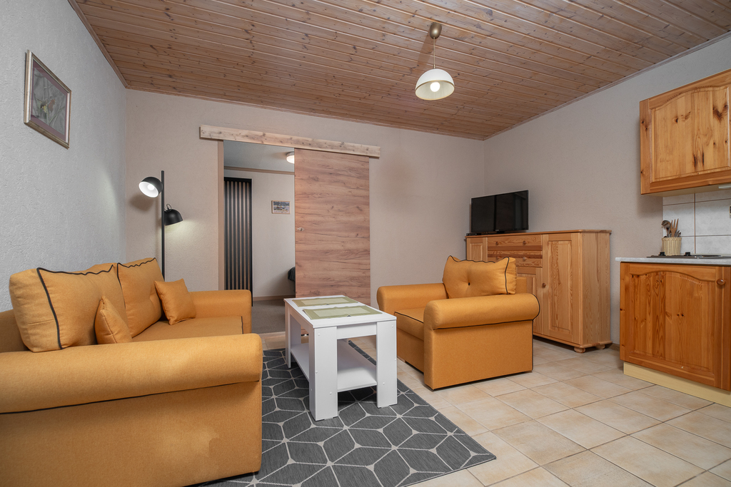 Duży budynek pensjonatu: 2 apartamenty dla gości, 2 mieszkania dla personelu, suszarnia, garaż, warsztat, magazyny, pralnia, pomieszczenie socjalne dla personelu.