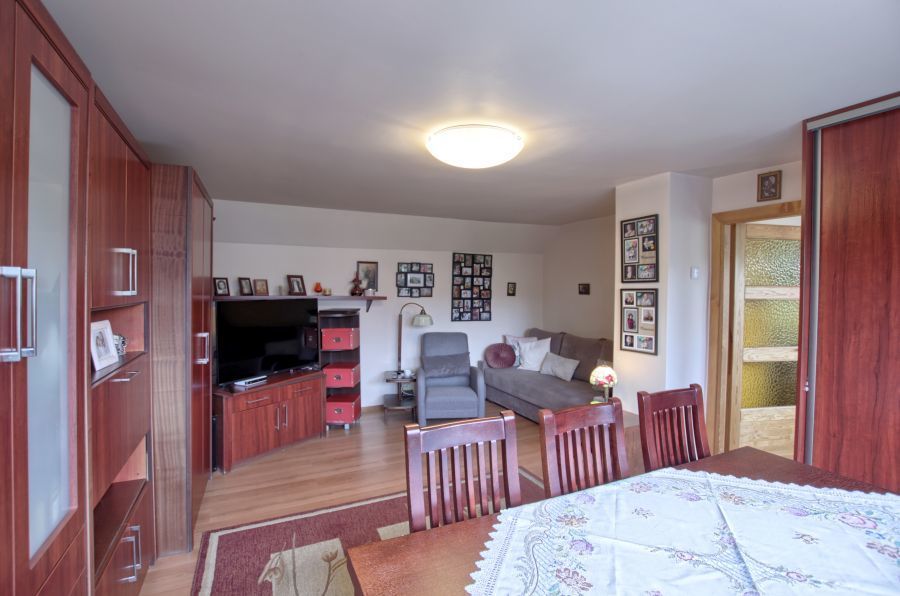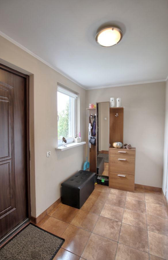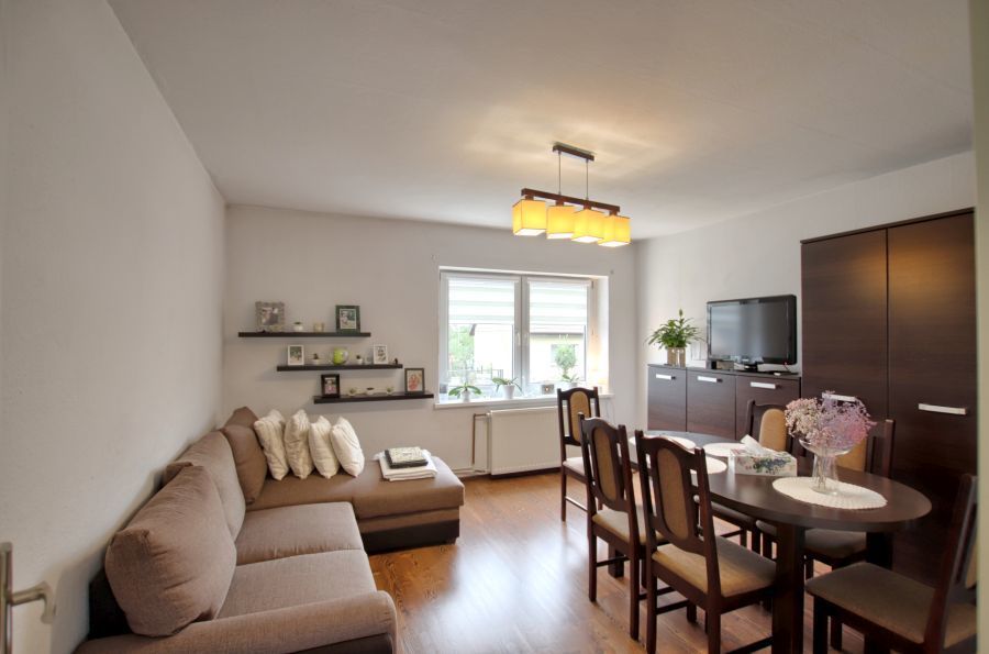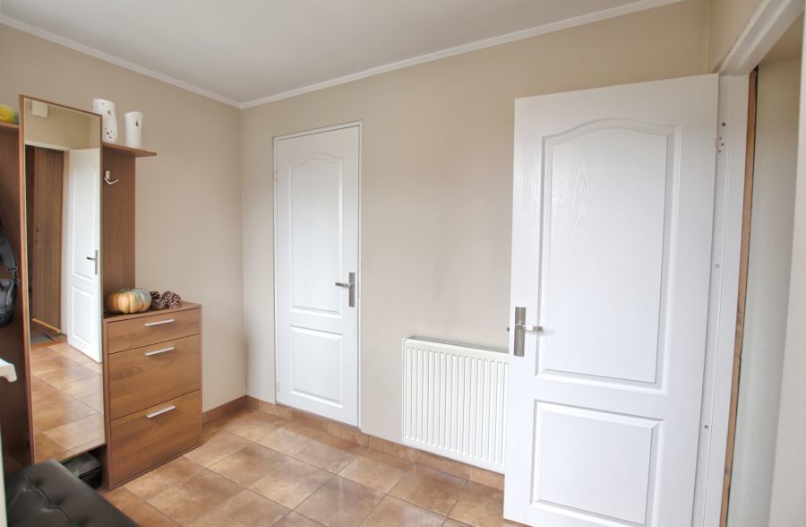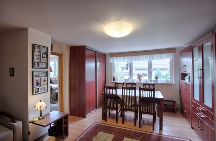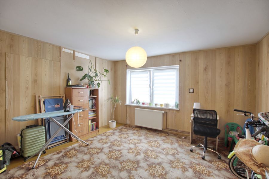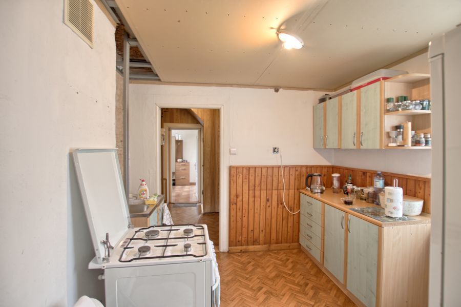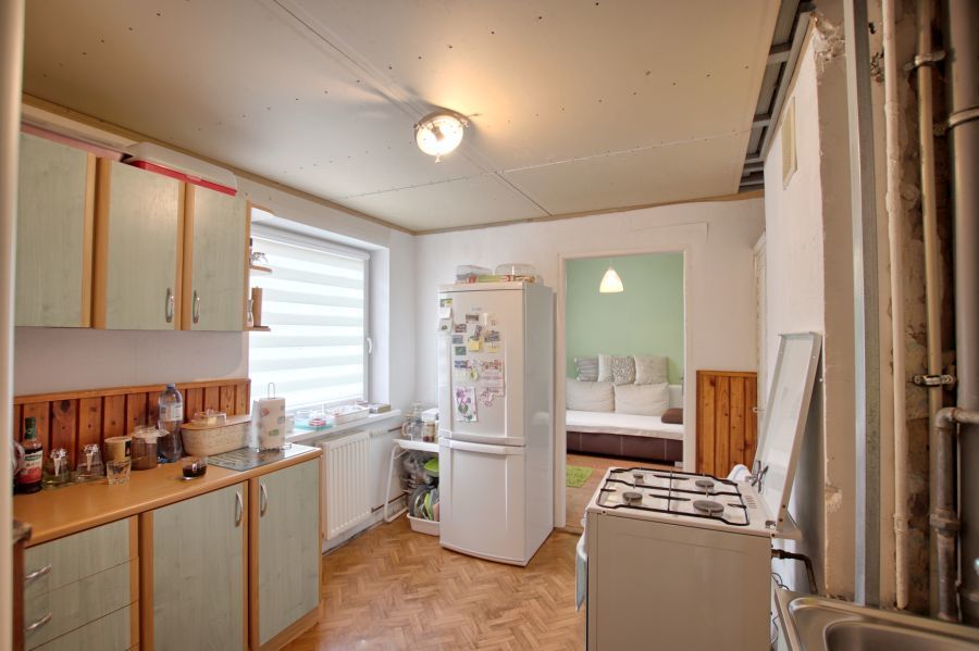 Na parterze znajduje się mieszkanie 3 pokojowe w standardzie do kapitalnego remontu. Pierwszym pomieszczeniem po wejściu jest wiatrołap, w którym jest miejsce na szafę w zabudowie oraz wejście do łazienki. Dalej znajduje się przedpokój, z którego można wejście do dużego pokoju lub oddzielnego WC. Następnie korytarz prowadzi do kuchni, z której mamy wejście do kolejnych 2 pokoi. Ogrzewanie na tym piętrze w chwili obecnej jest z pieca węglowego.