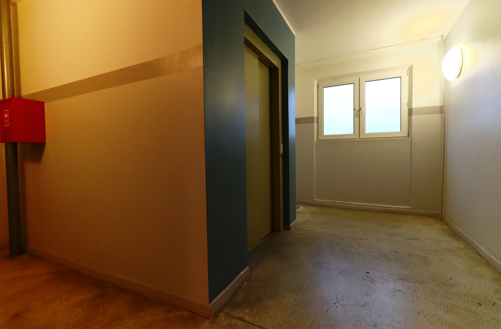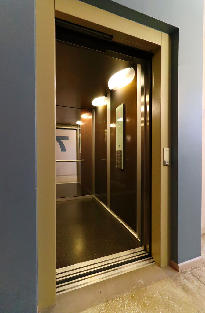 -Nowa duża winda w budynku.