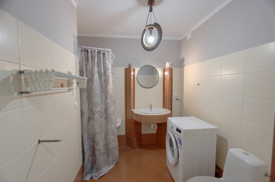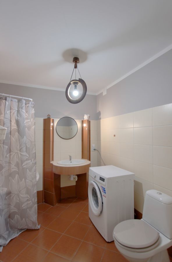 Kuchnia umeblowana i wyposażona w sprzęt AGD. W łazience jest pralka.