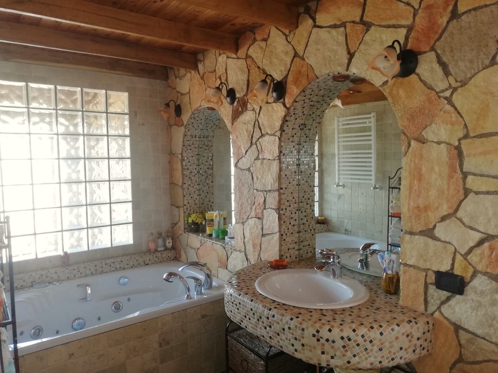Do budowy domu użyto najlepszej jakości materiałów takich jak płytki, kamień, dachówka portugalska i drewno kasztanowe oraz okna mahoniowe.