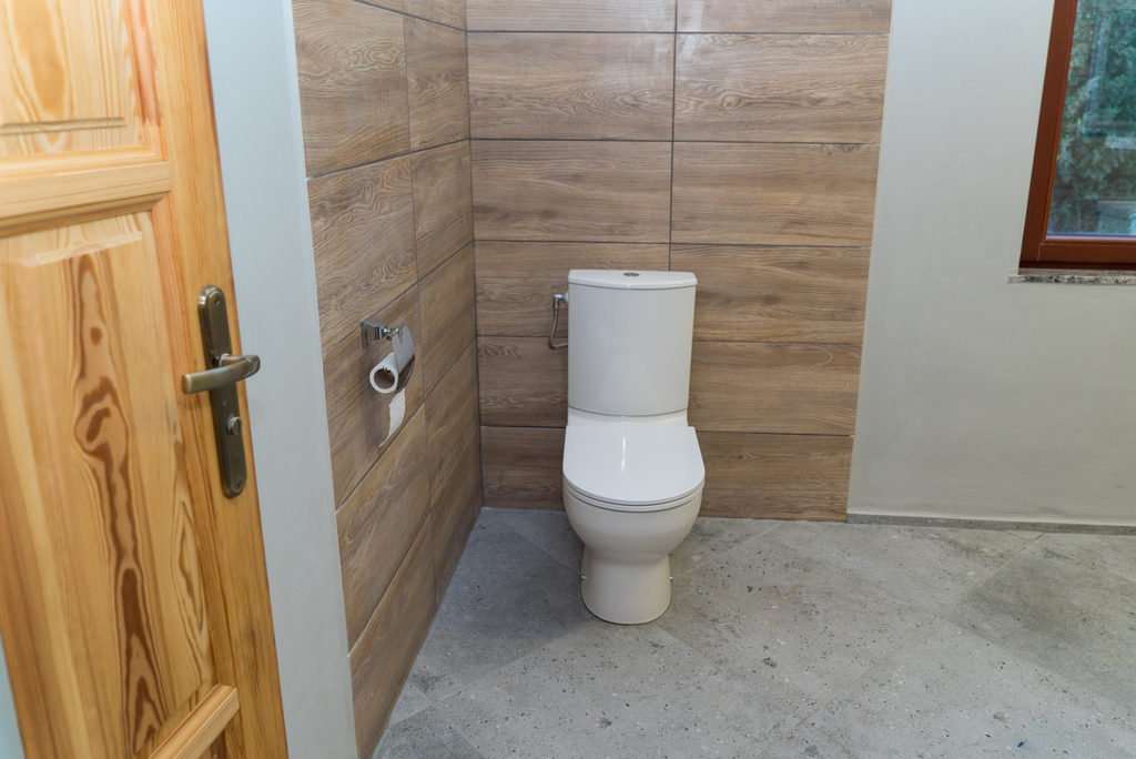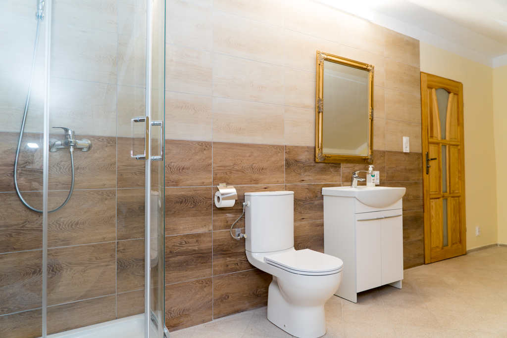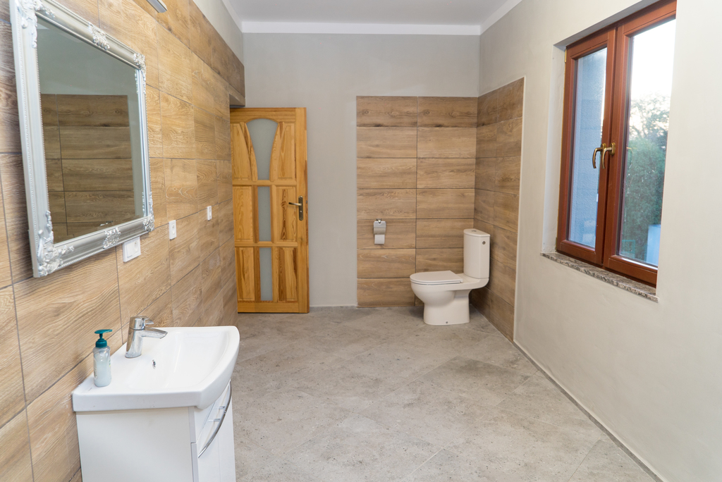 W łazienkach na podłodze terakota, a na ścianach częściowo glazura.