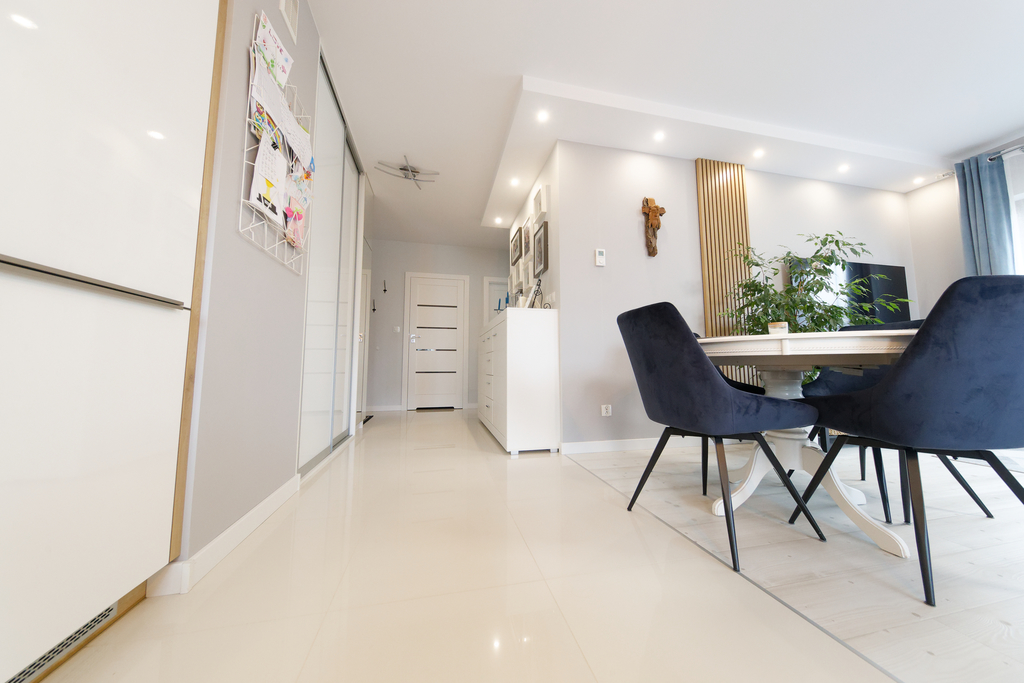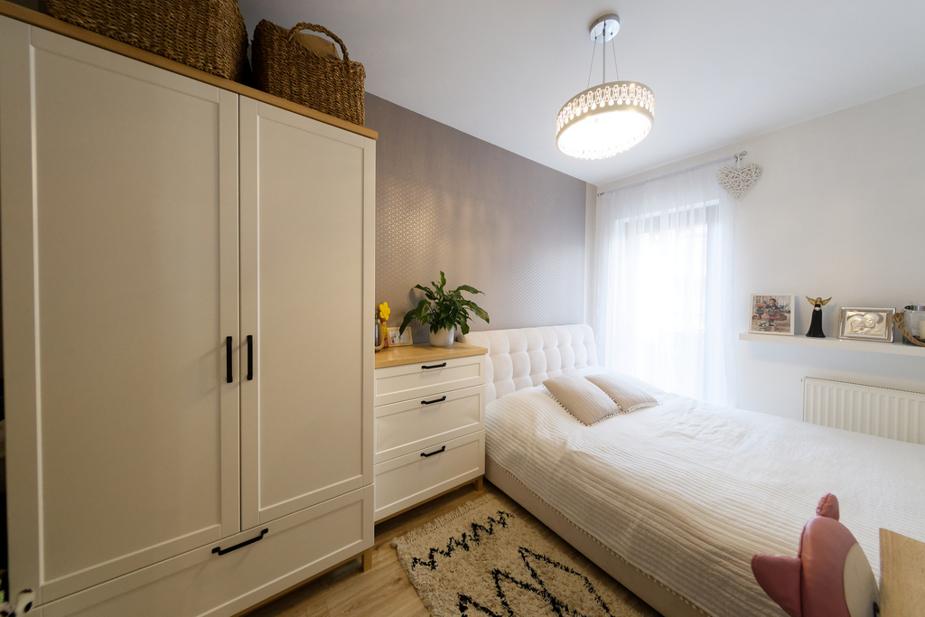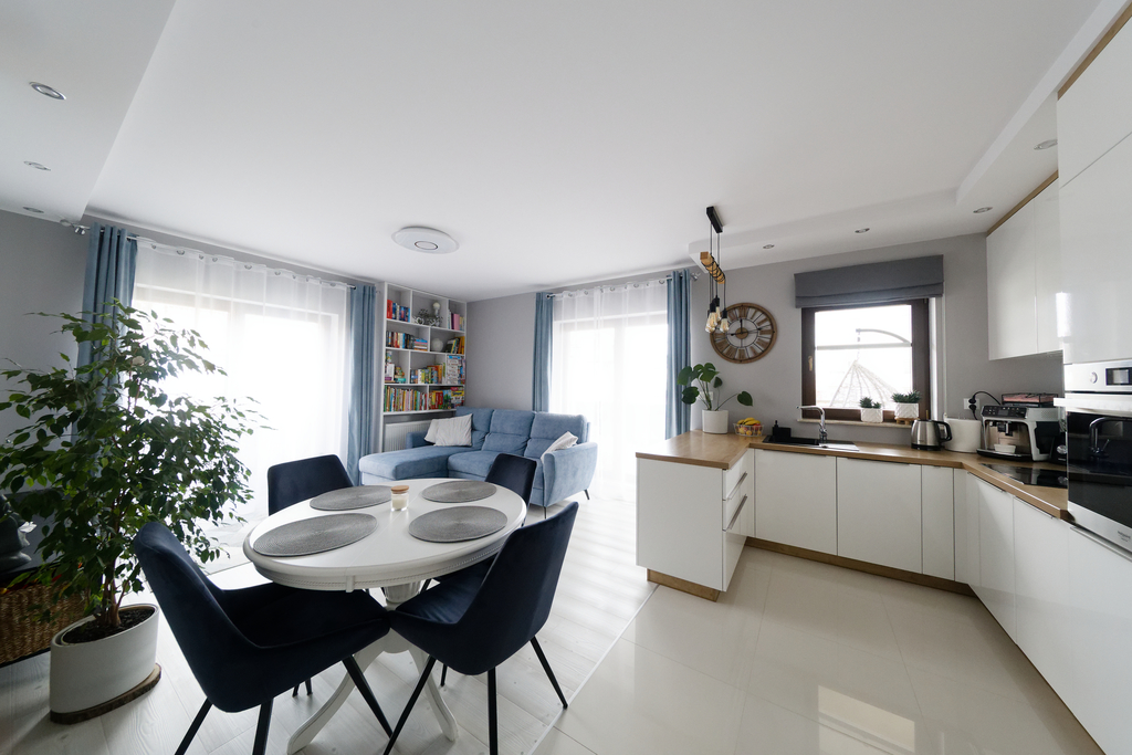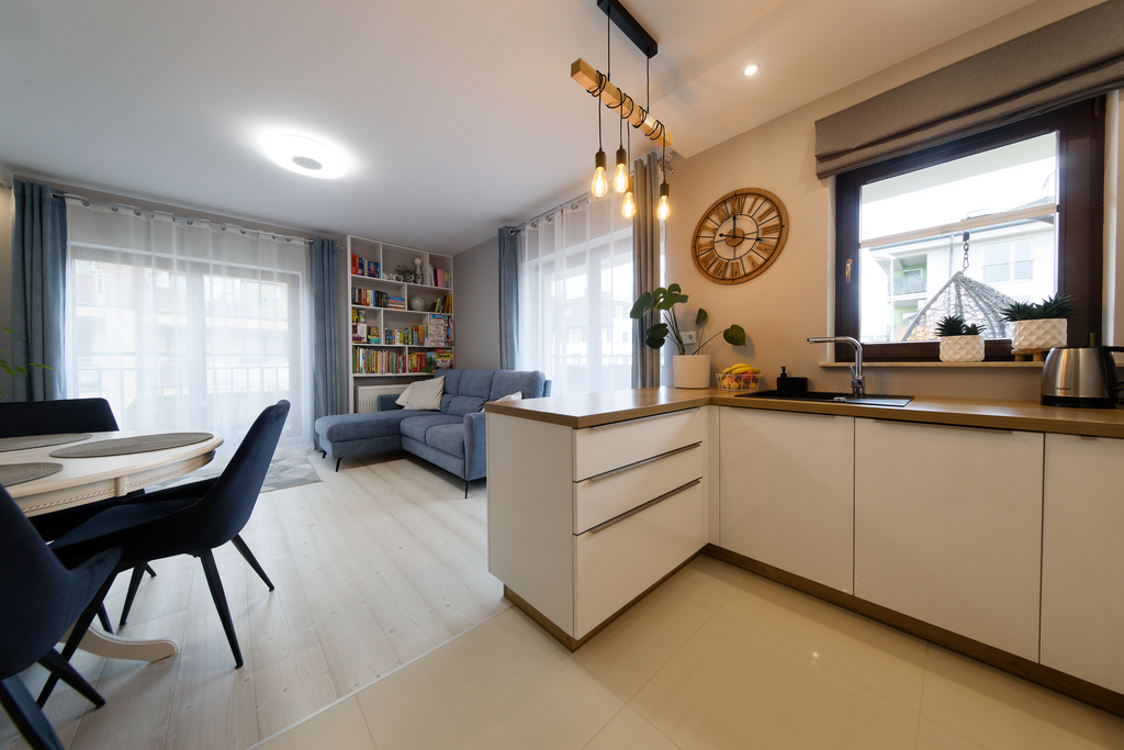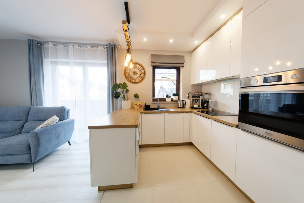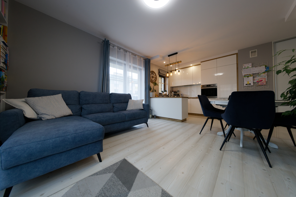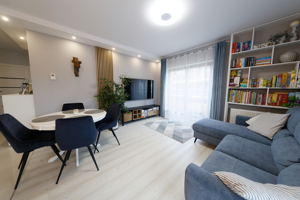 Apartament jest wyposażony w ogrzewanie i ciepłą wodę dostarczaną przez dwubiegowy gazowy piec SEC, co zapewnia efektywność i komfort. Standard wykończenia mieszkania jest idealny, z gładkimi i malowanymi ścianami w pokojach, oświetleniem LED, panelami na podłodze oraz kafelkami w kuchni i łazience. Kuchnia została zaprojektowana na wymiar przez renomowaną firmę "Verlani" i wyposażona w sprzęt AGD, w tym płytę indukcyjną, zmywarkę, piekarnik, lodówko-zamrażarkę oraz okap firmy Hotpoint, wszystko wykonane z dużą starannością i dokładnością.
