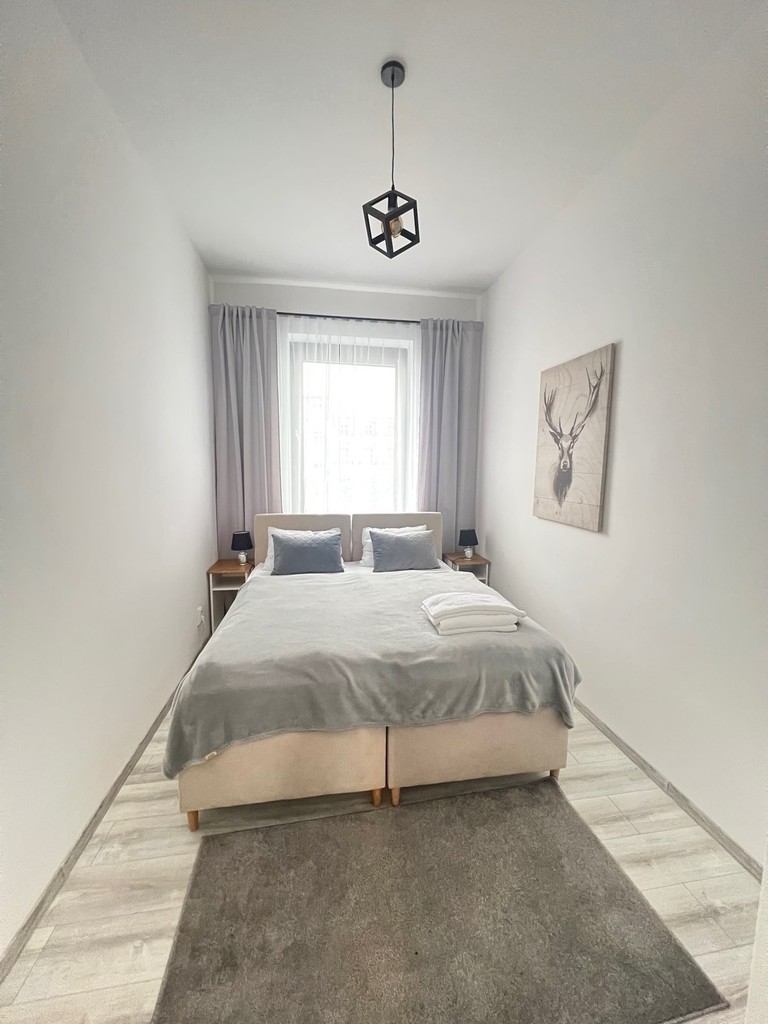 Mieszkanie zostało wykończone z dbałością o detale, zapewniając wysokiej jakości standard. Pozostaje w pełni umeblowane oraz wyposażone zapewniając wygodę przyszłemu właścicielowi bądź najemcom. Ogromny metraż mieszkania przypada na 3 przytulne sypialnie, przestronny salon z aneksem kuchennym oraz łazienkę z osobnym wc. Atutem są udogodnienia dzięki dostępowi do komórki lokatorskiej, instalacji internetowej, telewizji kablowej i wideo domofonu. Dodatkowo mieszkanie posiada w pełni elektroniczne zamki oraz zintegrowany system gwarantując bezpieczeństwo i bezobsługowy najem.