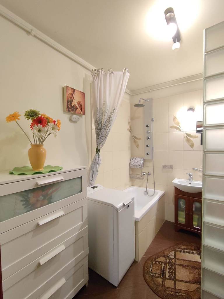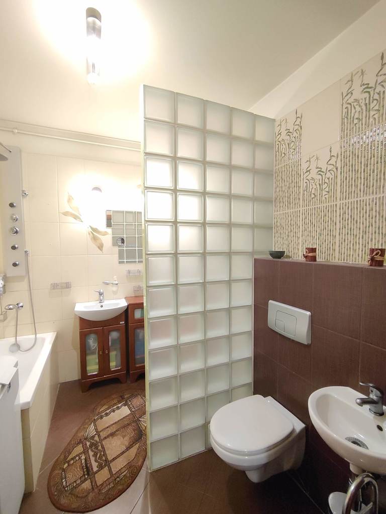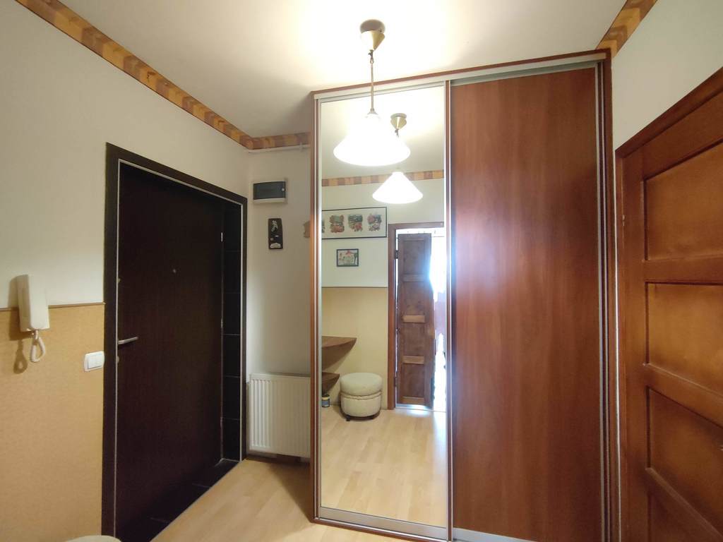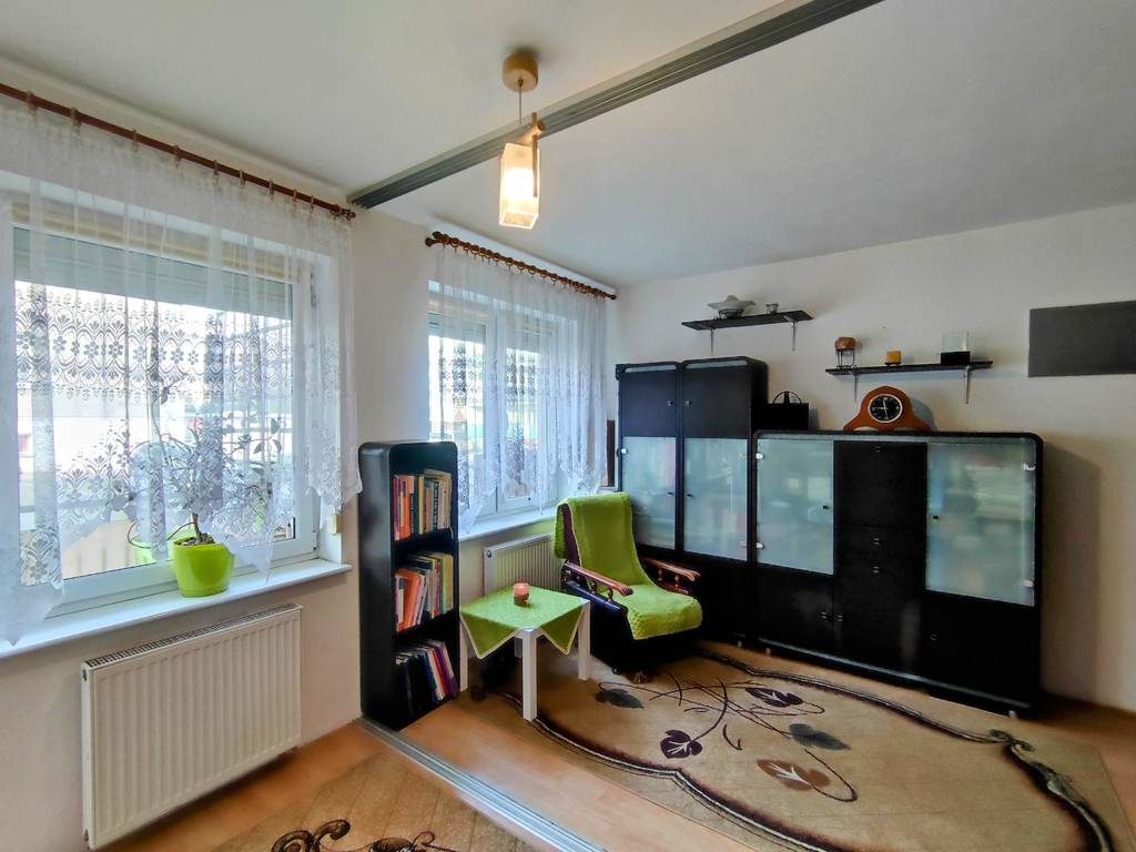 Lokal znajduje się na parterze budynku z 2005r., i składa się z dużego pokoju, aneksu kuchennego oraz łazienki i przedpokoju. Stawiając jedną tylko ścianę można uzyskać osobny pokój z kuchnią w aneksie oraz drugi pokój. Ściany gładzone oraz malowane, na podłodze panele. Zpokoju wyjście na balkon a w oknach oraz drzwiach balkonowych rolety zewnętrzne. Duża łazienka w kaflach oraz terakocie w której spokojnie mieści się wanna i pralka.