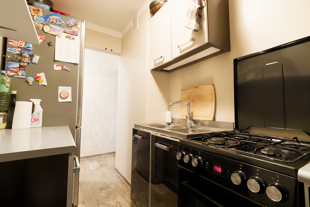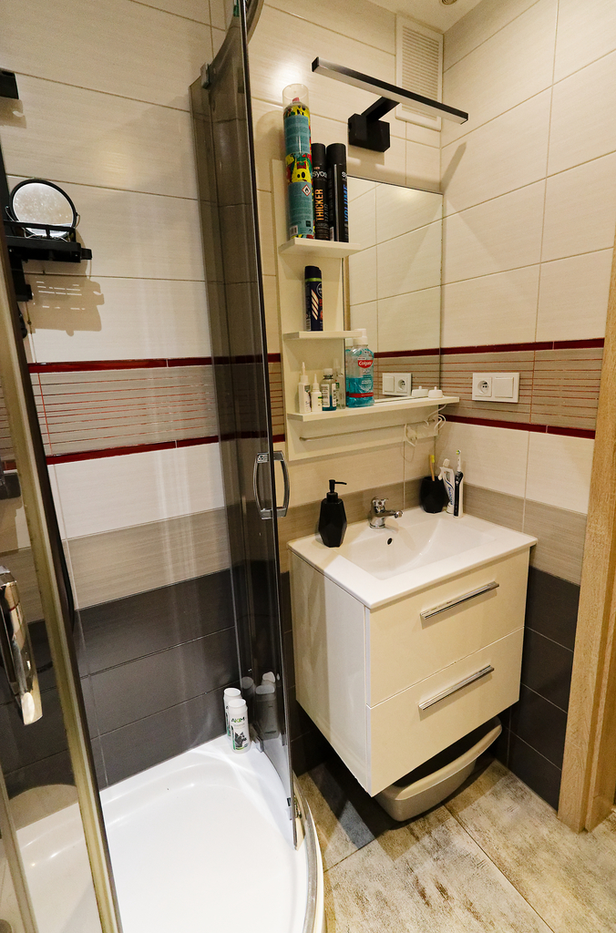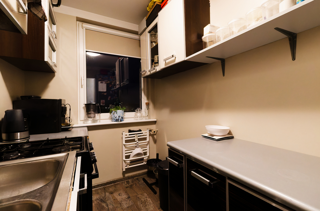 Mieszkanie przeszło generalny remont, w wyniku którego zostały wyrównane sufity, ściany i podłogi.