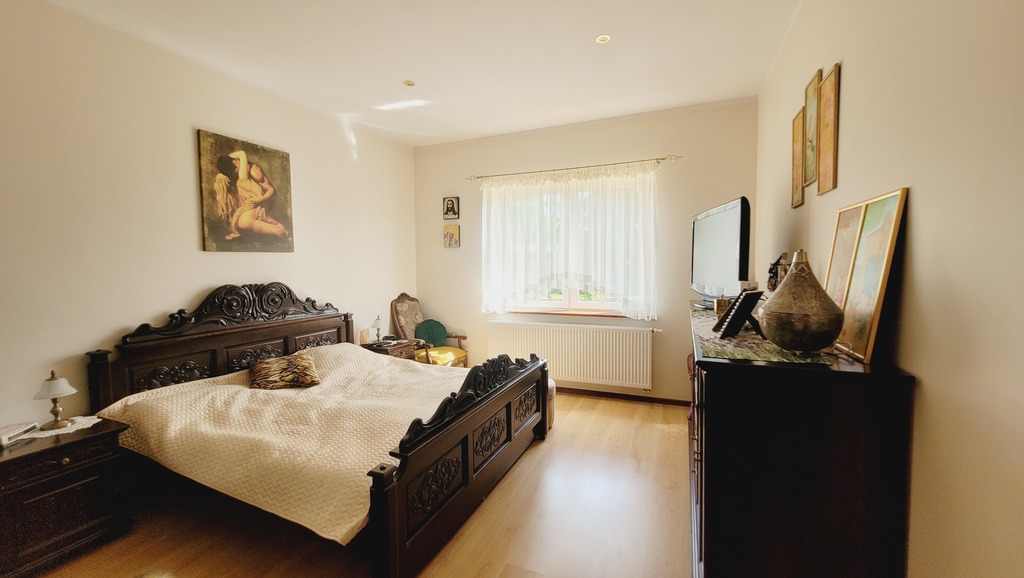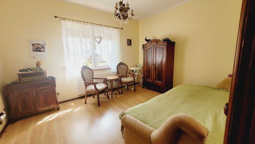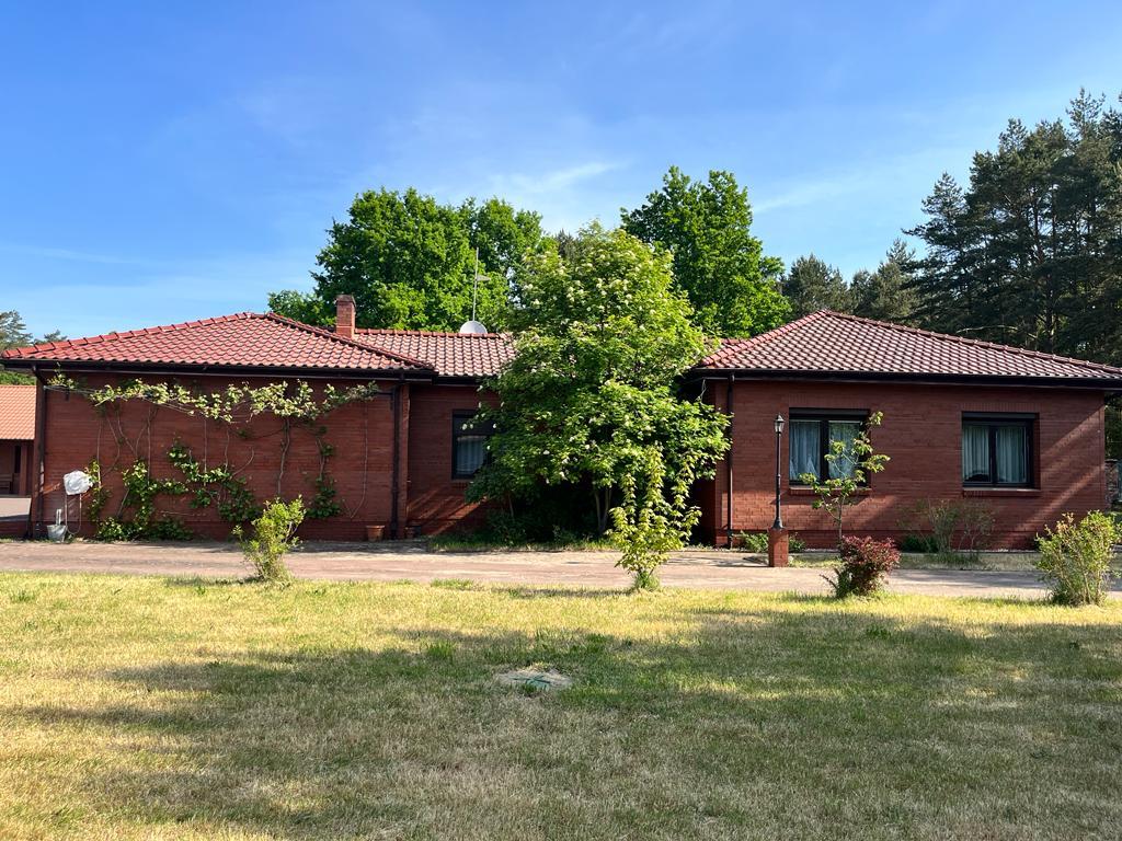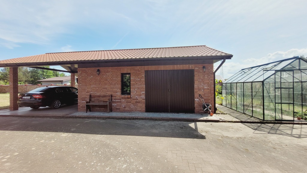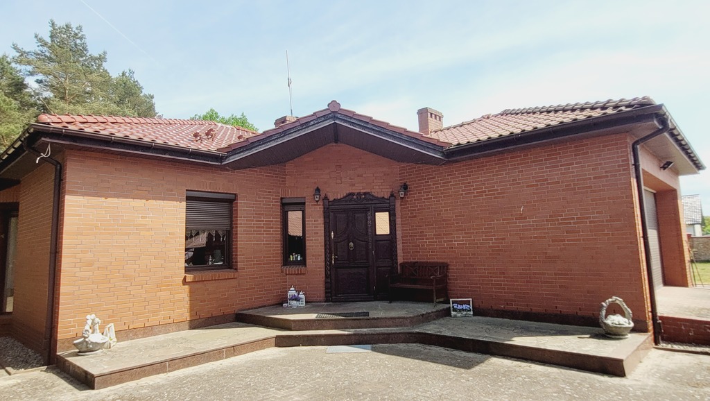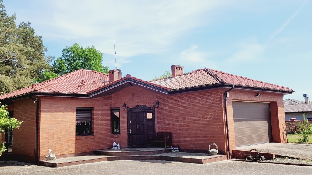 Parterowy dom zaprojektowany w nowoczesnym stylu o powierzchni użytkowej 161,90 m2 . Powierzchnia całkowita domu to 219,3 m2.Nieruchomość położona jest na bardzo dużej działce siedliskowej w kształcie kwadratu o powierzchni 4123 oraz z przylegającego do niej lasu o powierzchni 3310m2 na którym prócz drzew pospolitych rośnie kilka Dębów , które maja ponad 100lat. . Całość ogrodzona płotem z cegły. Tworząc jedną niepowtarzalną działkę o powierzchni 7433m2. Dom jest w pełni wyposażony i umeblowany( w cenie pozostają meble kuchenne oraz meble biurko i witryna w jednym z pokoi) co sprawia, że jest gotowy do zamieszkania. Projekt domu został przemyślany tak, aby każdy czuł się w nim swobodnie i komfortowo .Wykończony wyłącznie z wysokiej jakości materiałów. Meble kuchenne drewniane w zabudowie z blatami granitowymi. Dom składa się z dużego salonu z jadalnią (39,7m2) z wyjściem na duży taras, 3 sypialni ( 14,8m , 18,6m2 13,1m2) przestronny hol, łazienka w wc , wc oraz kotłowni z pralnią. Duży garaż dwustanowiskowy o powierzchni 27m2. Dach domu pokryty dachówką ceramiczną. Dach ocieplony wełną mineralną o grubości 0,5m .Okna w domu wszystkie PCV dobrej jakości. We wszystkich oknach rolety antywłamaniowe. Dom wykończony cegłą klinkierową , która stanowi dodatkowe ocieplenie. Dom ocieplony bardzo dobrze ( 3 warstwy izolacyjne ) Dom może być ogrzewany zmiennie - gruntowa pompa ciepła renomowanej firmy "Nibe" oraz nowoczesny piec kaflowy z kominkiem , który idealnie wpasowuje się w salonie. Własna studnia głębinowa Na zewnątrz - urokliwy, zadbany, ogród z dużą liczbą nasadzeń otoczony płotem z cegły.