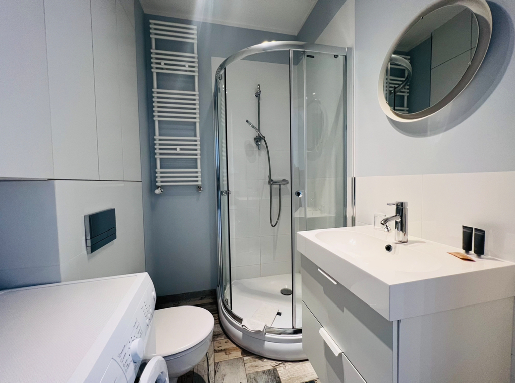 - łazienka z kabiną prysznicową i WC; pralka