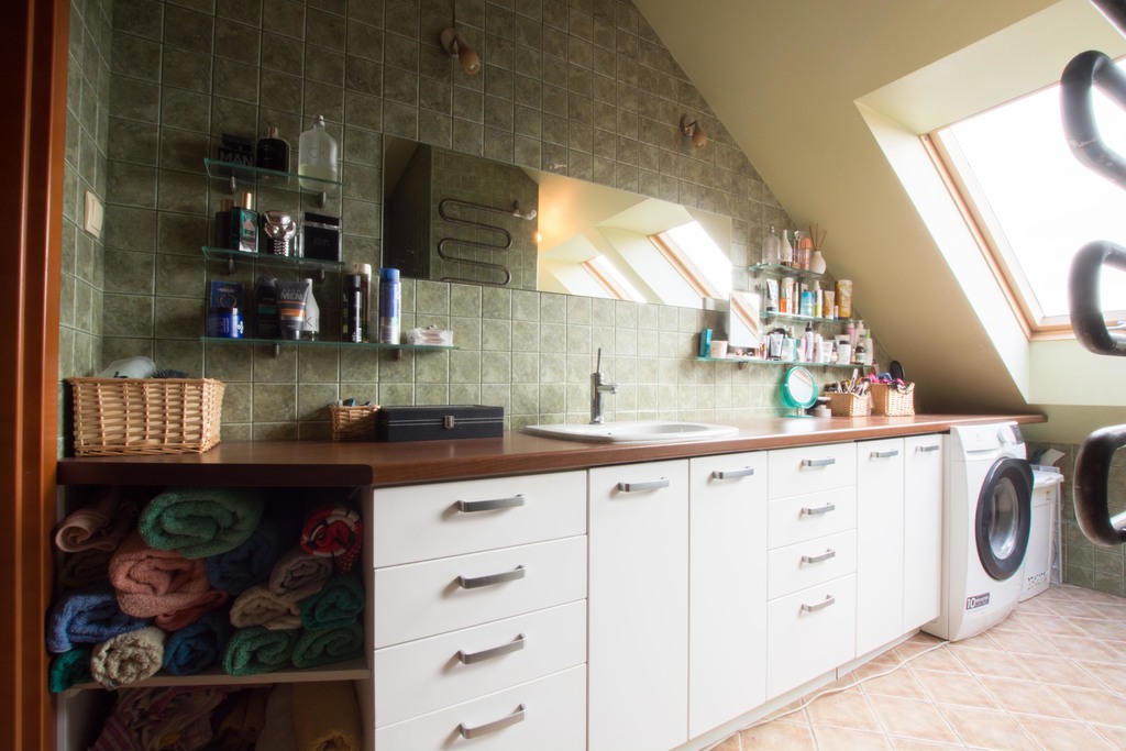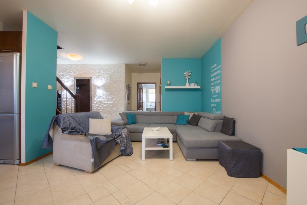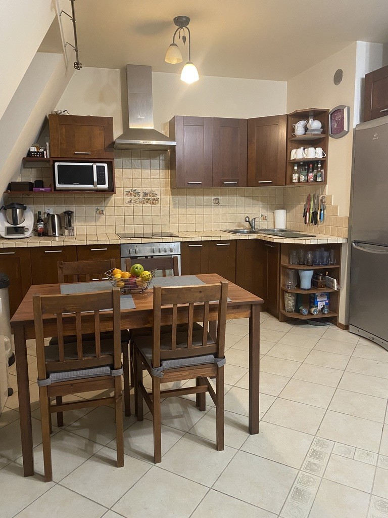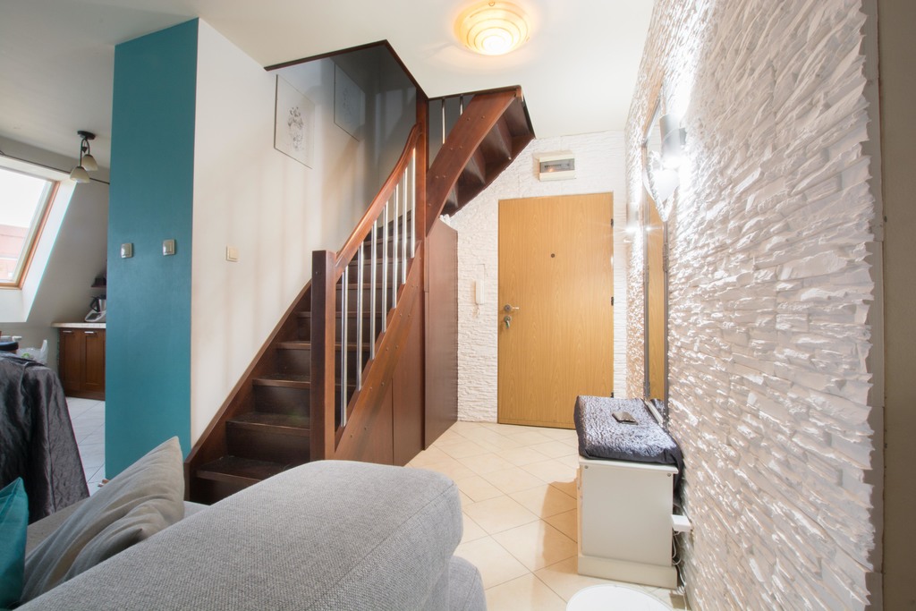 -duży salon z wyjściem na mały balkon, salon połączony z kuchnią w aneksie kuchennym, meble na wymiar wraz ze sprzętem AGD (okap, zmywarka 60cm, płyta grzewcza elektryczna, piekarnik), na tym poziomie znajduje się również sypialnia oraz pierwsza łazienka wyposażona w kabinę prysznicową, przedpokój z zabudową szafą pod schodami.