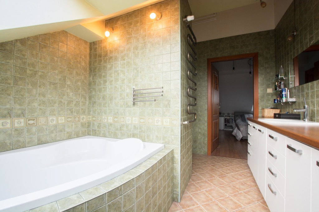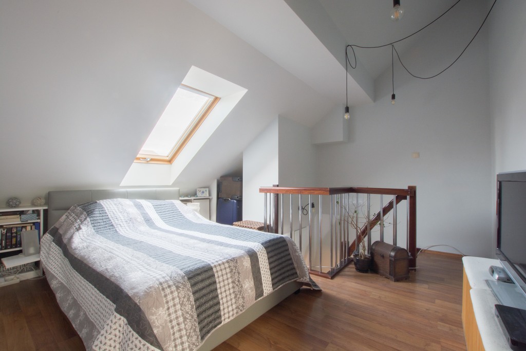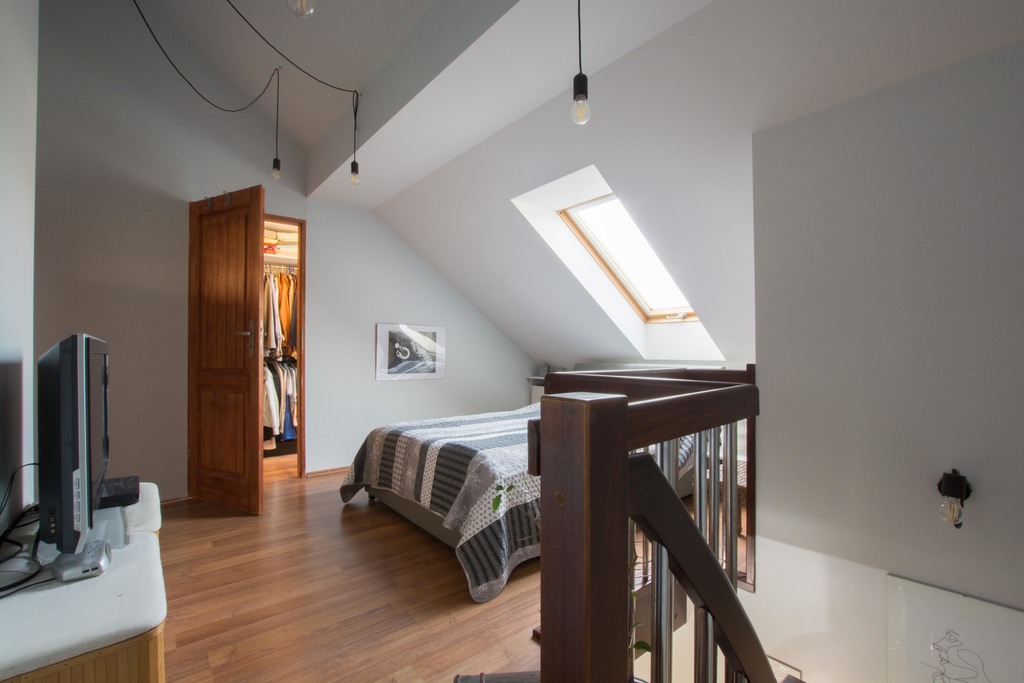 -prowadzą na niego drewniane schody, znajduje się na nim duża sypialnia z garderobą, przestronna łazienka z WC wyposażona w narożną wanną.