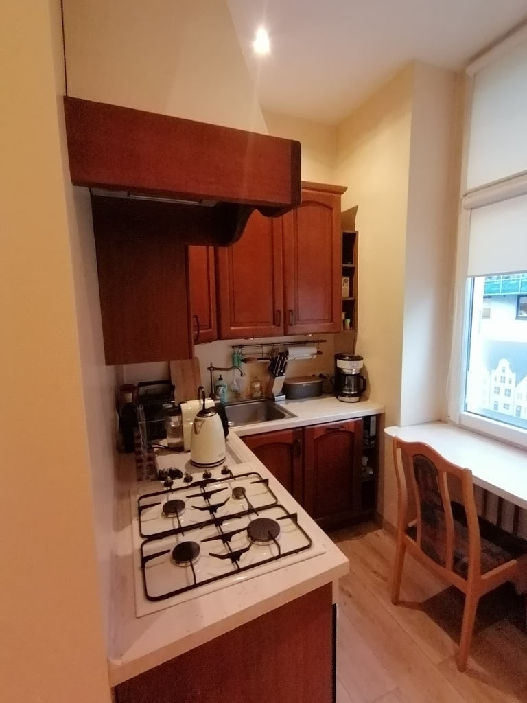 Kuchnia w zabudowie wyposażona w: zlewozmywak, płytę grzewczą gazową, piekarnik, zmywarkę, lodówko-zamrażarkę.