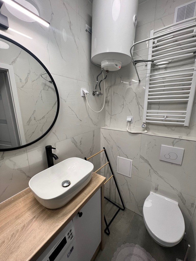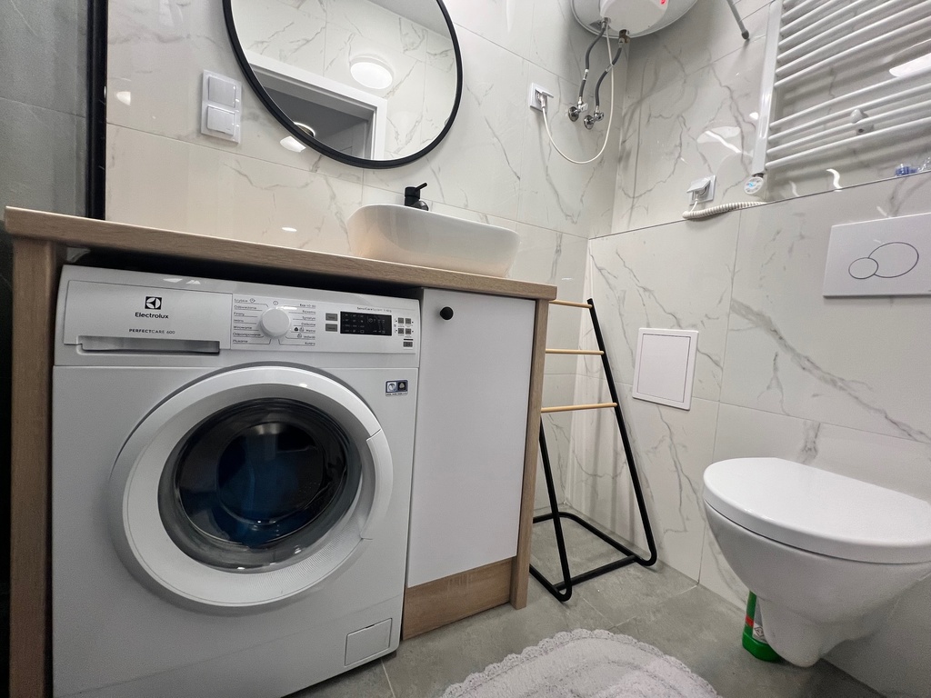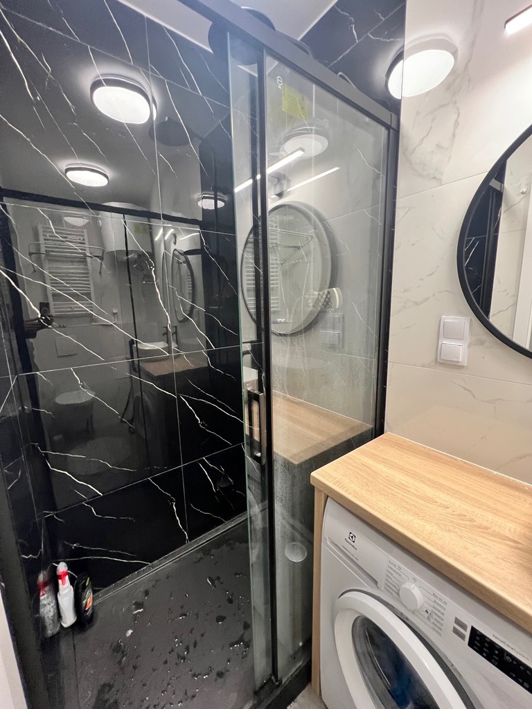 Piękna, nowoczesna łazienka z prysznicem, nową pralką, na podłodze terakota. W łazience zamontowano nowy bojler o pojemności 50 l. do podgrzewania wody.