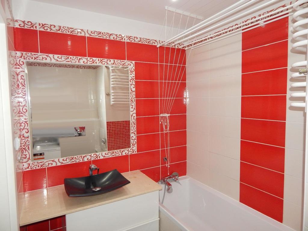 Łazienka z wanną, w gustownej, nowoczesnej glazurze i terakocie. Nad wanną suszarka sufitowa.