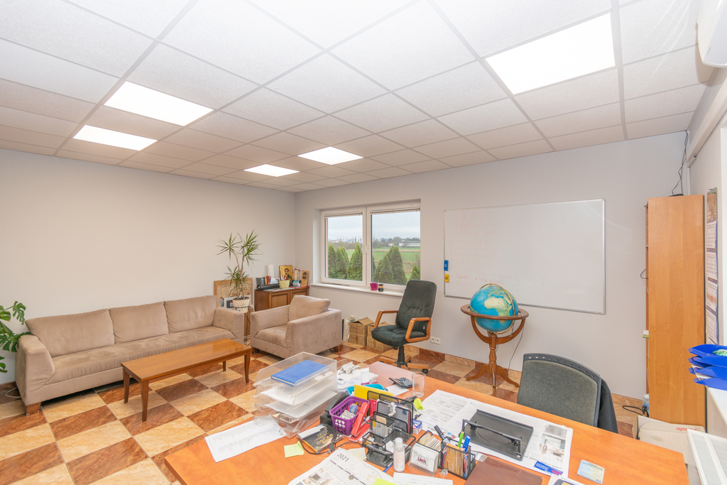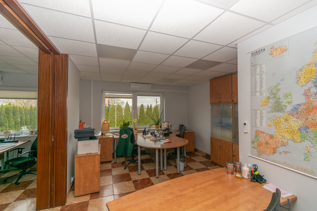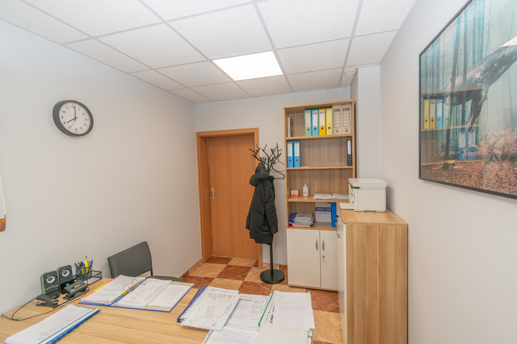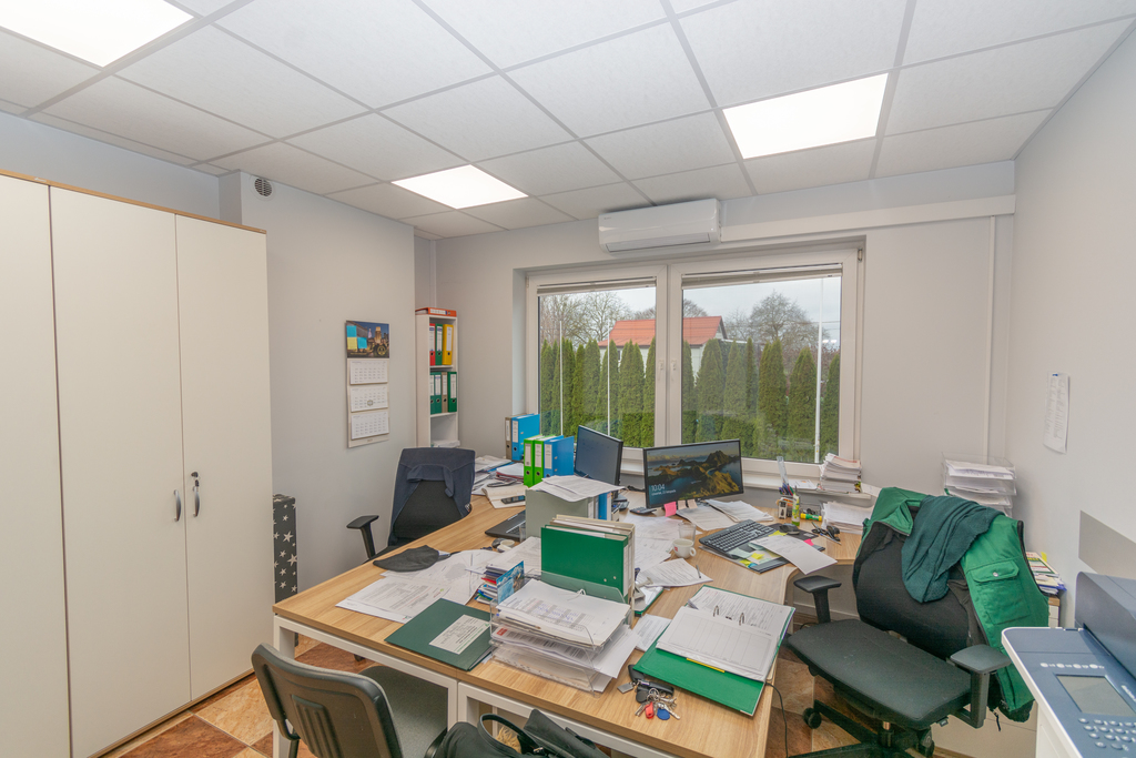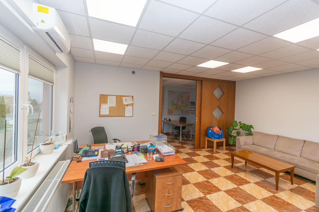 Na piętrze pomieszczenia biurowe wraz z toaletami o powierzchni 135m2, wyposażone w klimatyzacje.