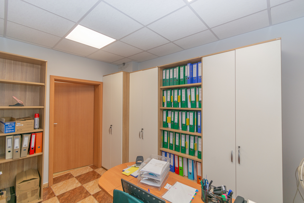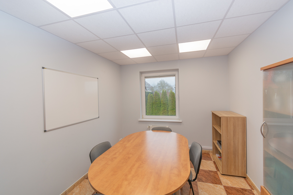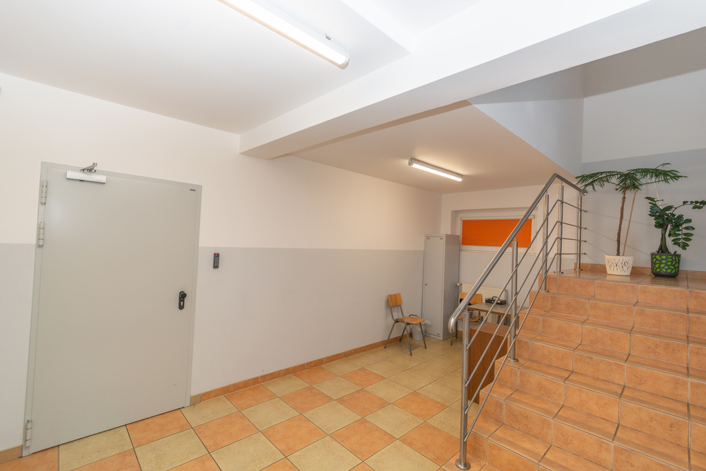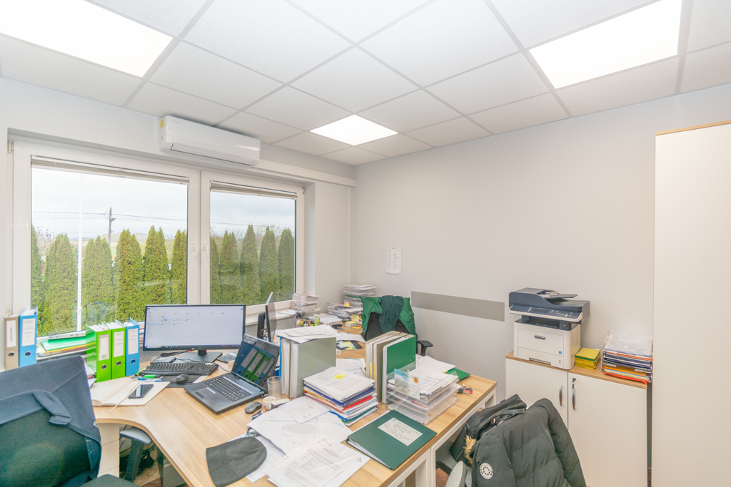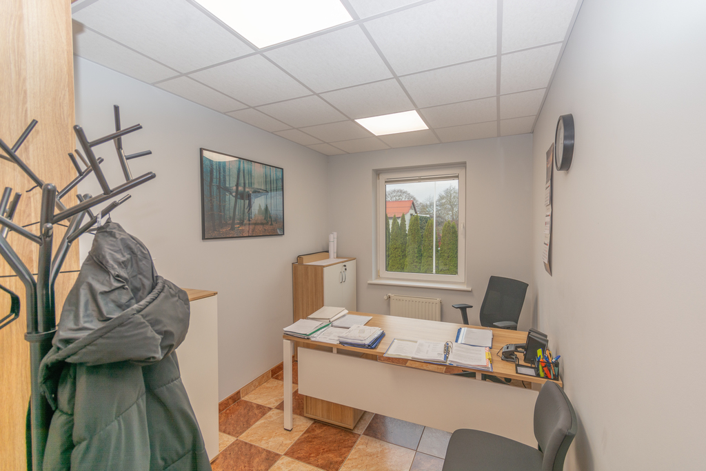 Na piętrze pomieszczenia biurowe wraz z toaletami o powierzchni 135m2, wyposażone w klimatyzacje.