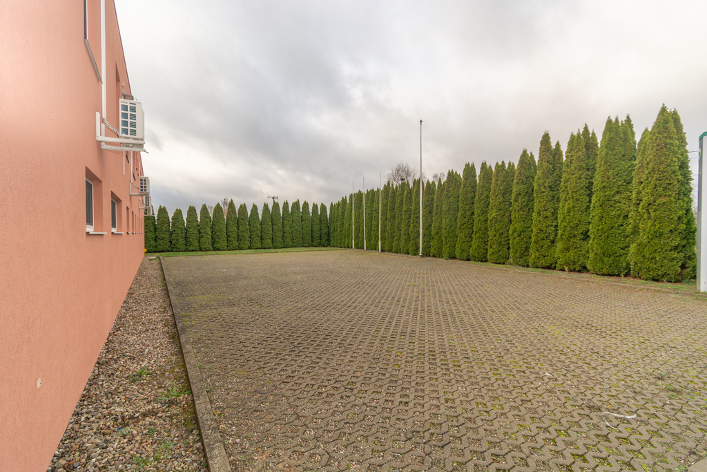 Teren ogrodzony, monitorowany, wyłożony kostką.