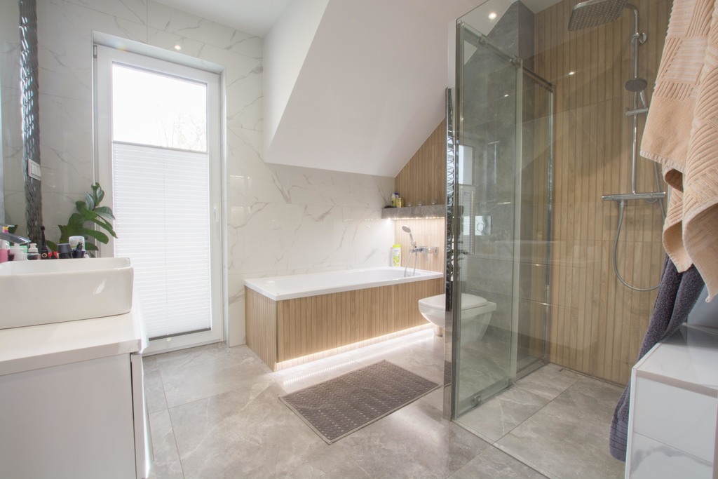 -WC firmy Koło, deszczownica z barterami łazienkowymi Grohe.