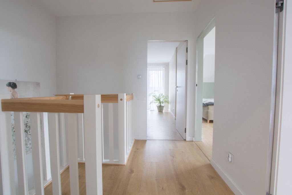 -podłogi: kafle w salonie i w łazienkach, w pokojach i salonie panele klasy AC5, schody ze stopniami wykonanymi z drewna jesionowego,