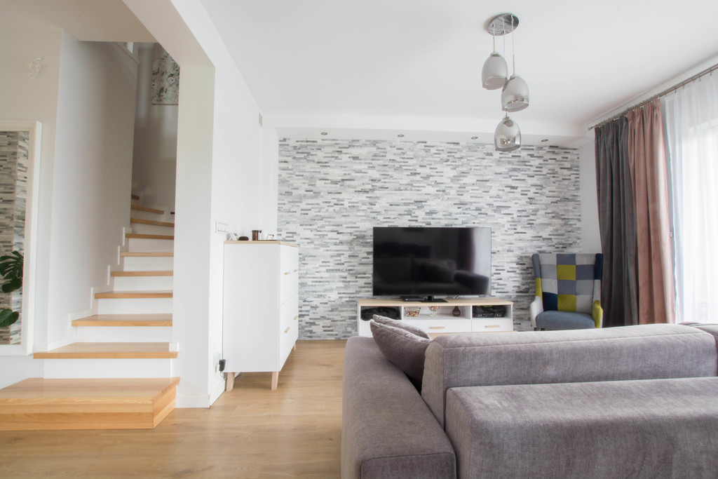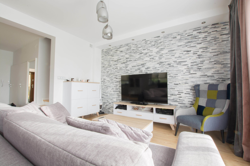 -ściany: w salonie dwie ściany z wykonane z dekoracyjnego kamienia kwarcowego, wszystkie ściany gładzone i pomalowane.