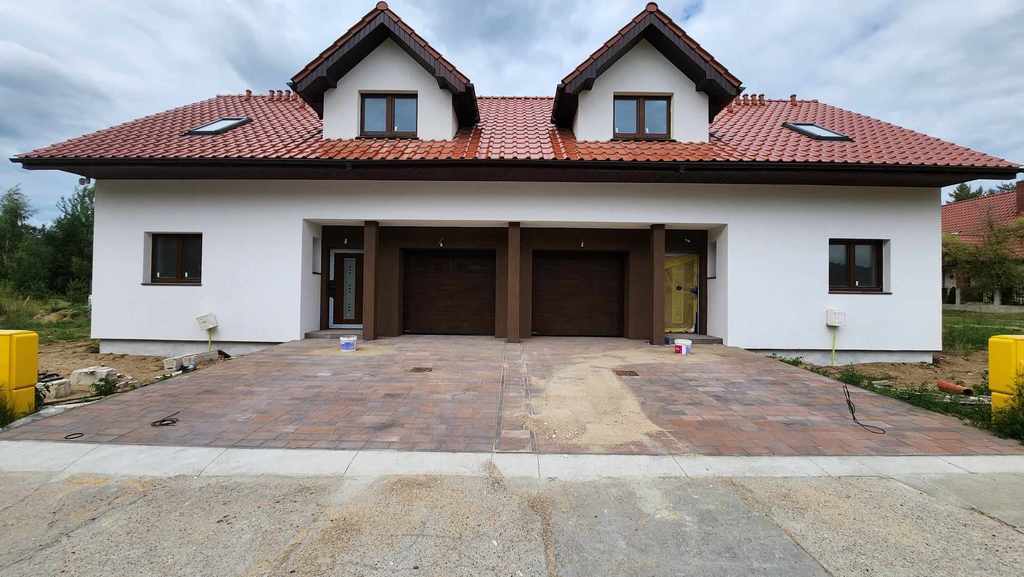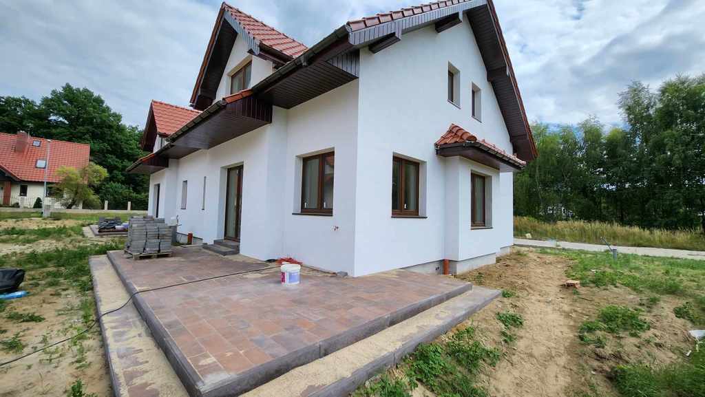 Dom o powierzchni użytkowej 135,21 m2, zaś całkowitej 146,68 m2, wybudowany z porotermu, dachówka ceramiczna, okna 3-szybowe, ogrzewanie i ciepła woda z pieca gazowego, ogrzewanie podłogowe na parterze i piętrze, skrzynki pod rolety nad oknami; wyprowadzenie pod kominek; brama garażowa automatyczna na pilota; podjazd do garażu i podejście do drzwi wyłożone kostką chodnikową, podłoga w garażu wyłożona płytkami.