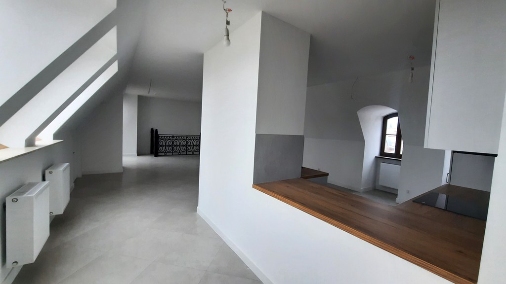 - II poziom: obszerny pokój z aneksem kuchennym, 2 mniejsze pokoje, łazienka.